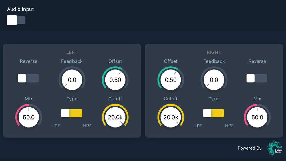 - Stereo delay effect with delay offset, reverse mode, feedback and mix