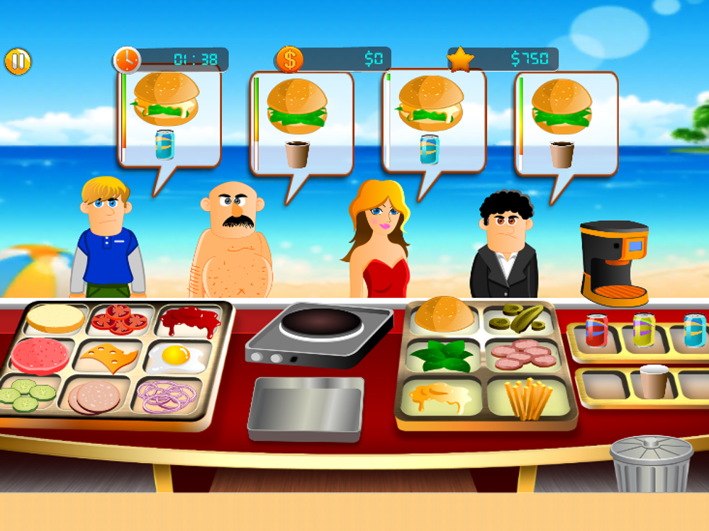 作为汉堡餐厅的一名雇员,你的工作就是给以尽量快的速度服务尽量多的顾客。你从顾客那接到点单,为他们准备三明治和汉堡,小点心和饮料。玩得越多,就会出现越丰富的食材!速度越快,就会得到更多的收入!