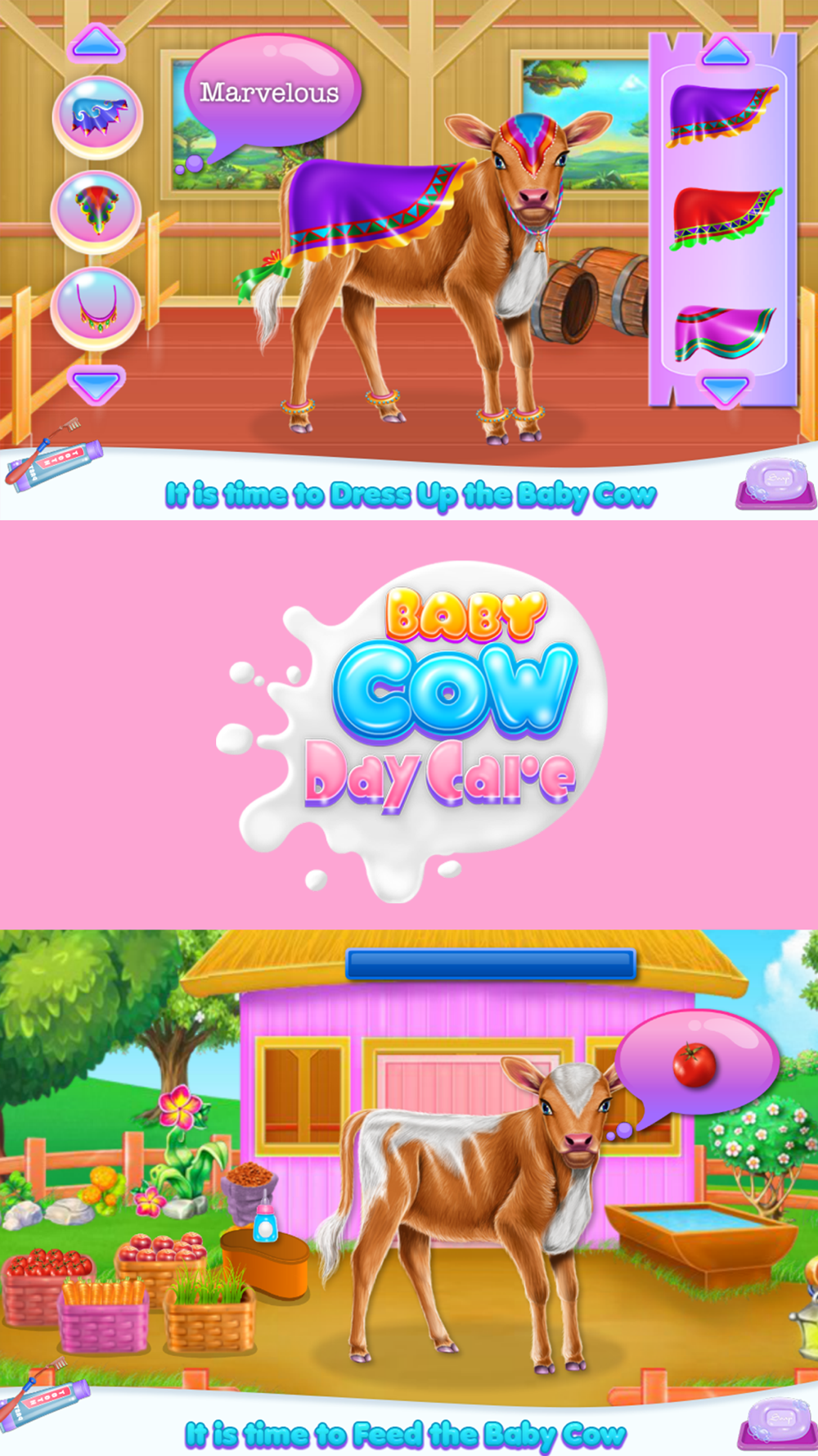 Welcome into the animal world and come to explore the diversity of a cow's caring taker. Clean, design and feed as for a real person. So this is how your job as a cow owner begin. As you've seen the fur is not looking amazing and you are about to clean it and make sure the little cow is happy with the new one. Start with the part where you wash her teeth and make sure they are stronger and ready for the eating part. Now you have to remove that layer of dirt that spread all over her skin, then make sure you apply some shampoo to clean the dust gather on it. Rub until the fur is going to have a brighter color and then wash the bubbles to see the results. Keep it up and try to go to the next step which includes the part where you prepare and offer food. Follow the instructions to give the right food in the suitable order. The cow is asking for it in a bubble image and what you spot you have to bring, so in this way, the baby will have his tummy fulfilled and will be for sure happy. Once the caring phase is over you will have to deal with the dressing up. Use your creativity and add pretty accessories to complete this cow look. Try your best to accomplish all the given responsibilities and have fun to learn how to take care of a little baby cow. You might use these skills you've earned during this game even in real life and you will see how much this virtual experience helped you out.