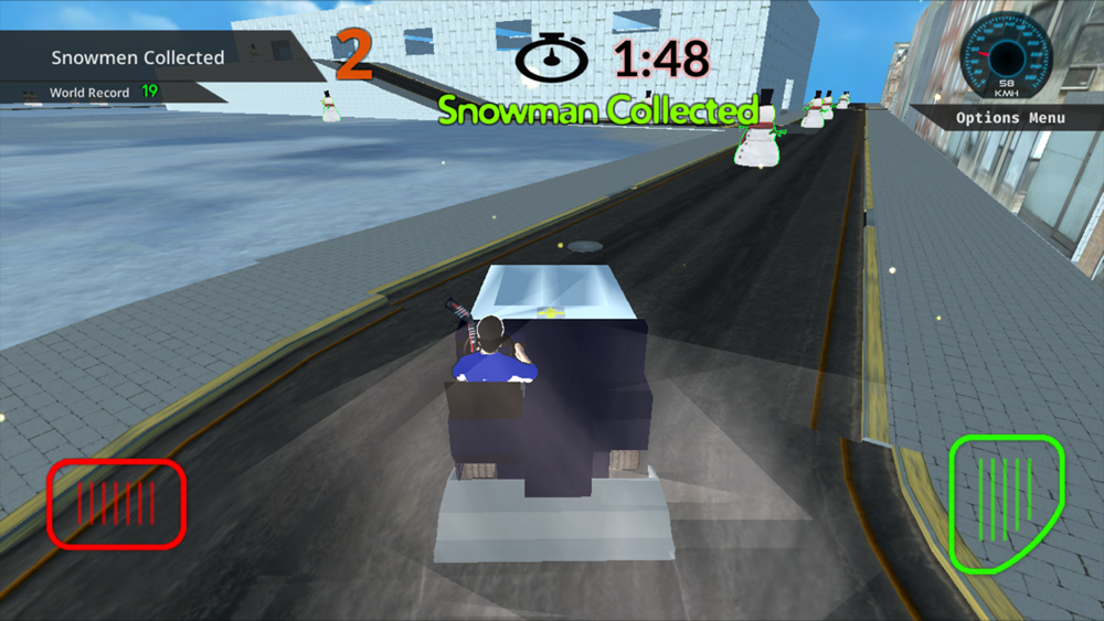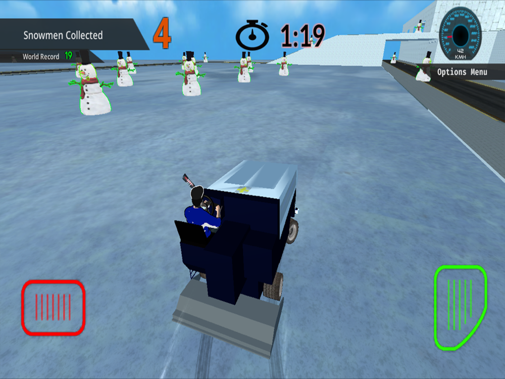 Collect as many snowmen as possible in 2 minutes driving an Ice Resurfacing machine using accelerometer tilt steering, or touch.