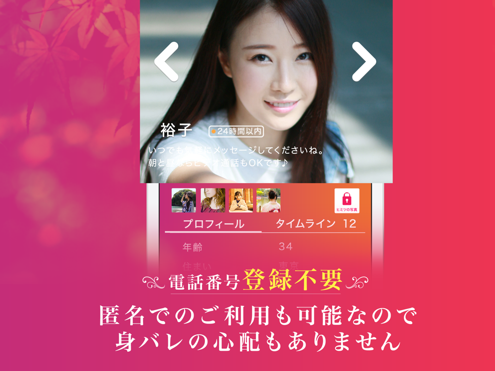 普通の登録者のふりをして、個人情報を抜き取るような、いわゆる「サクラ」と呼ばれる登録ユーザーが稀にいます。そのようなユーザーは徹底的に排除し、安心してご利用頂けるように常に監視を行っております。また、アプリ内のブロック機能を使うことでユーザーの存在等を表示しないようにすることも可能です。