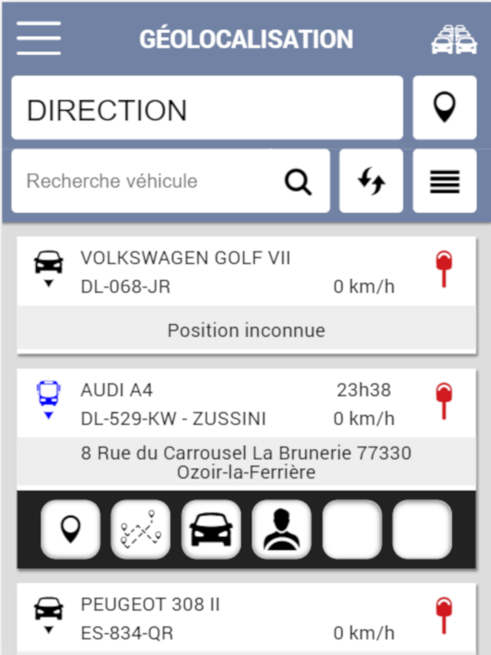 • Localisation : localisez vos véhicules et soyez informé de leur statut (à l’arrêt, en mouvement, vitesse, cap….)