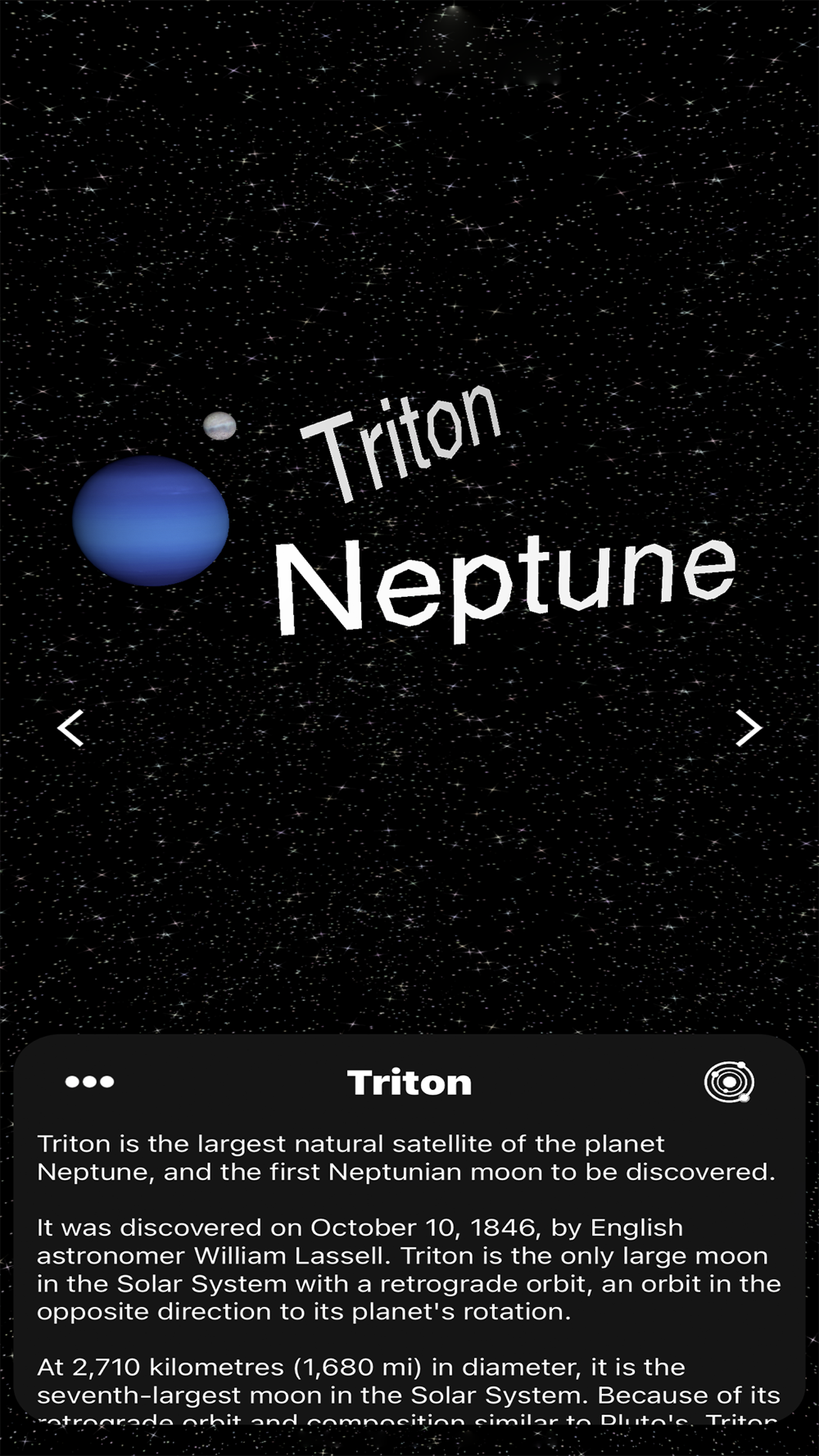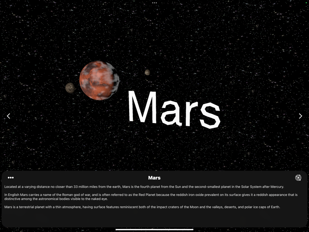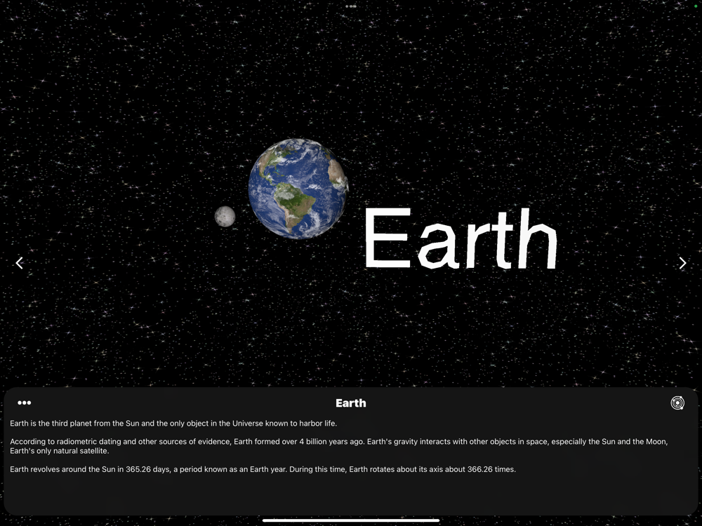 - Massive overhaul for performance improvements and bug fixes!- Added VR Mode!- Added Pause button!- Added 3D Camera!- Added a new song and description for the Solar System!- Improved spacing for all descriptions!- Rebuilt the entire app from the ground up!- New Screenshots!