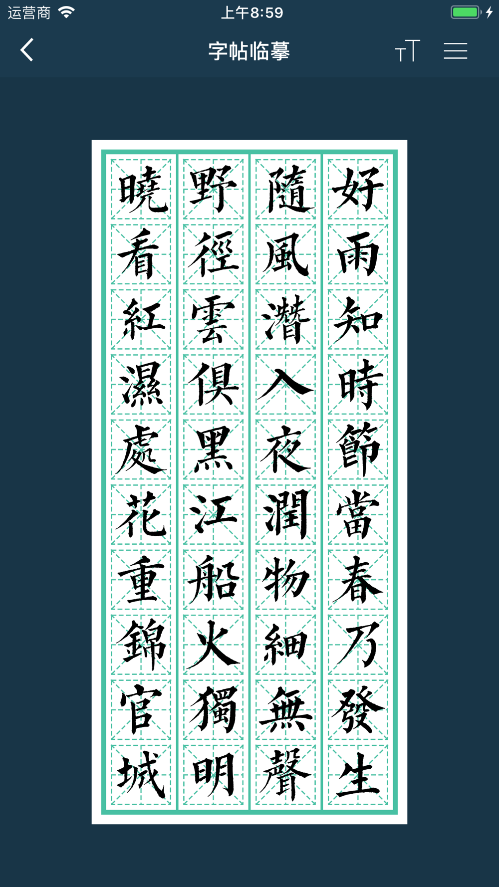输入任意文本即可生成颜、柳、赵、欧多种楷书字体的毛笔书法字帖,支持手写临摹,内置唐诗、宋词、元曲上千首。