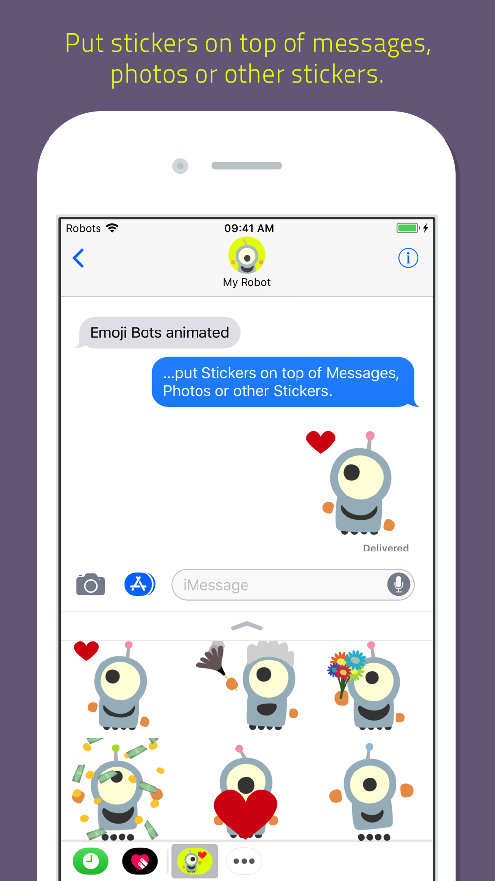 Enjoy the adventures and emotions of a little robot. Grab the „Emoji Bots“ sticker pack with 35 lovely illustrated and animated stickers and take your communication to the next level!
