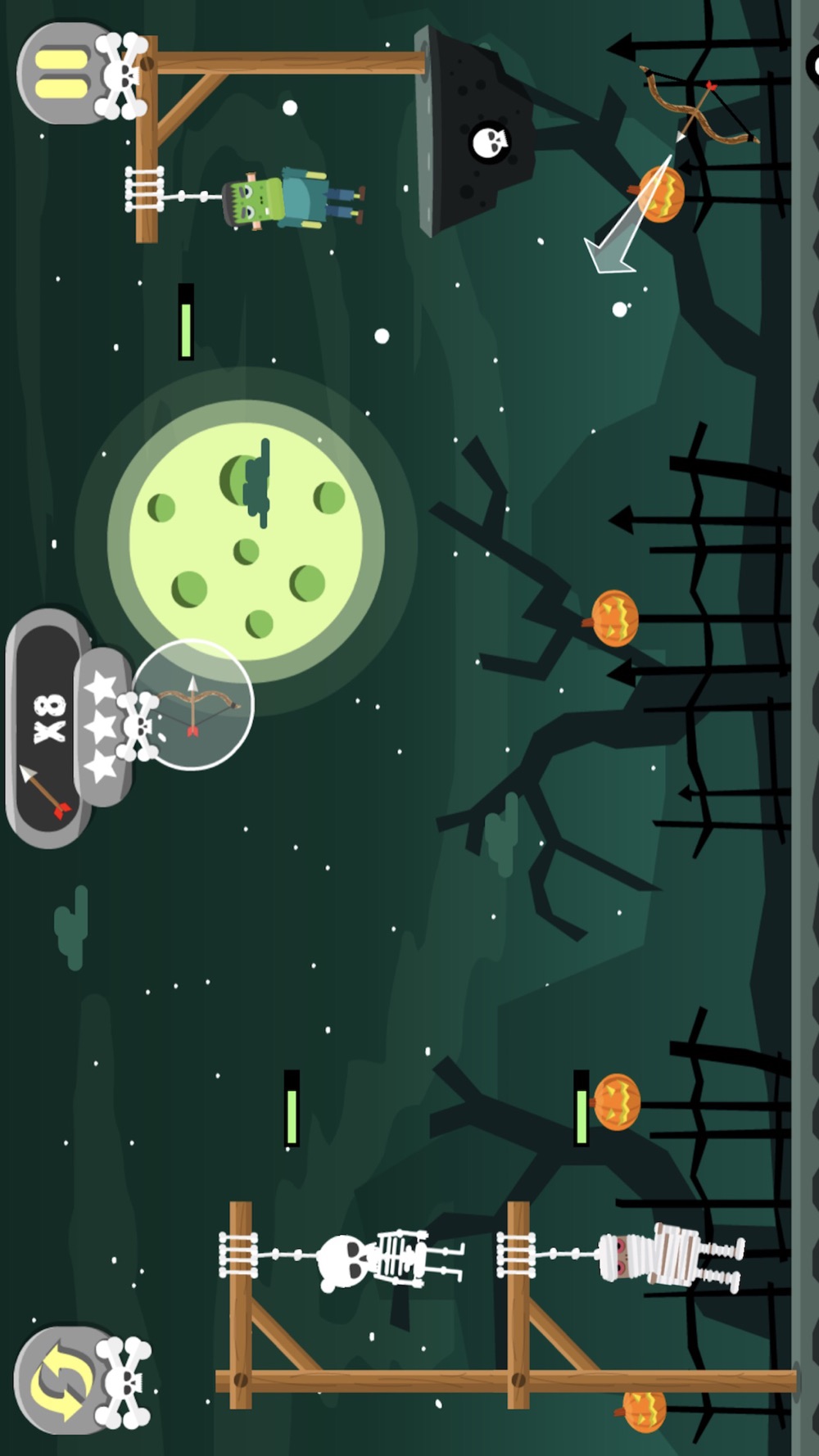 This game features cool spooky graphics and music, and exciting gameplay. During each level you must use your bow to shoot arrows at the rope that holds the monsters in place. Click and hold to draw back your bowstring and move your finger to aim it and increase your power.