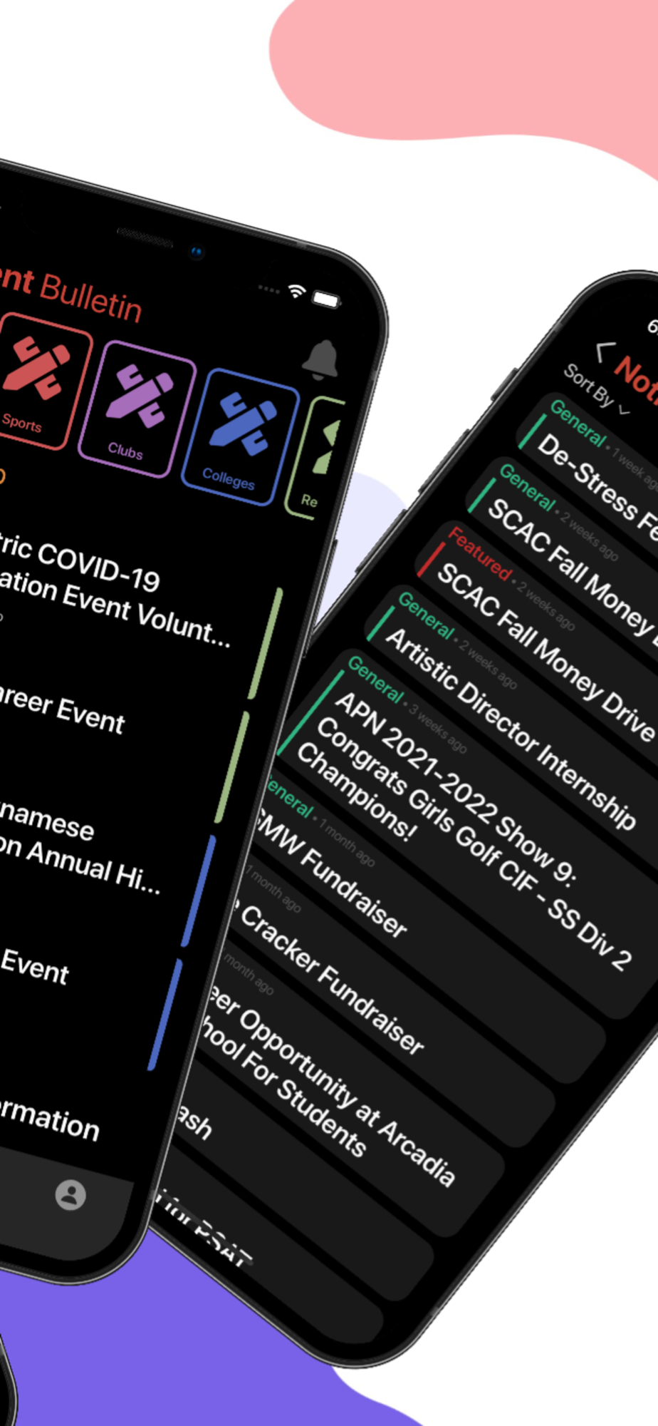 Student Bulletin: For more specific school-related updates, the bulletin covers five sections: Academics, Sports, Clubs, Colleges, and References. These sections have information regarding numerous topics such as Academic Team Tryouts, Sports Events, Club Informational Meetings, Scholarships, Important Resources, etc.