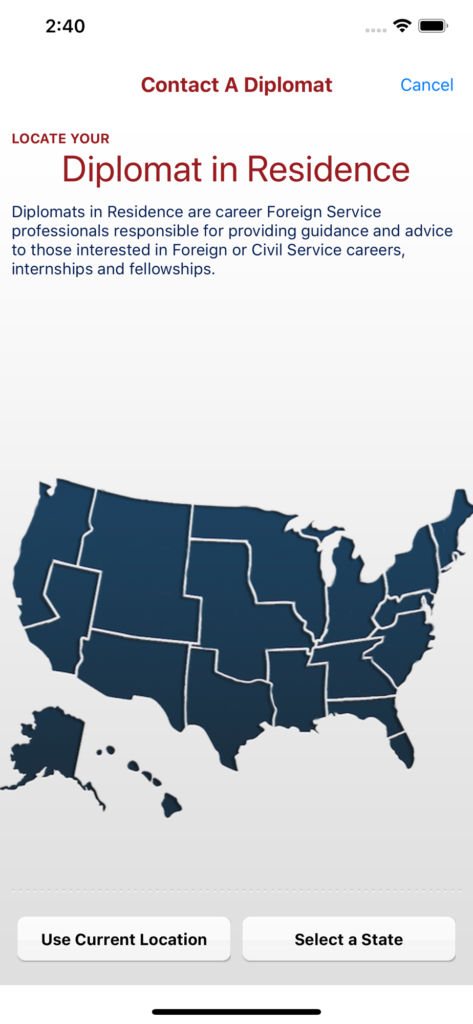 State Department’s Foreign Service employs U.S. citizens who are either Foreign Service Officers or Specialists. The Foreign Service Careers app explains and provides information on the five different Foreign Service Officer career tracks: Consular, Economic, Management, Public Diplomacy and Political as well as the eight different Specialist areas: Administration, Construction Engineering, Facility Management Information Technology, International Information and English Language programs, Medical and Health, Office Management and Security. In addition, aspiring diplomats can watch videos and learn about the experiences of State Department Employees who have chosen this career, as well as take practice tests to help prepare for The Foreign Service Officer test (FSOT). Those who download the DOS Careers can connect directly with a State Department recruiter. Just click on Attend an Event and you can find recruitment events close to your geographic location. Or contact a Diplomat in Residence (DIR) closest to your geographic location. DIRs are career U.S diplomats who are located throughout the United States and are responsible for providing guidance and advice to students, professionals and the community about Department careers. You can even explore the day-to-day responsibilities of Foreign Service employees when you choose the Interactive Experience.
