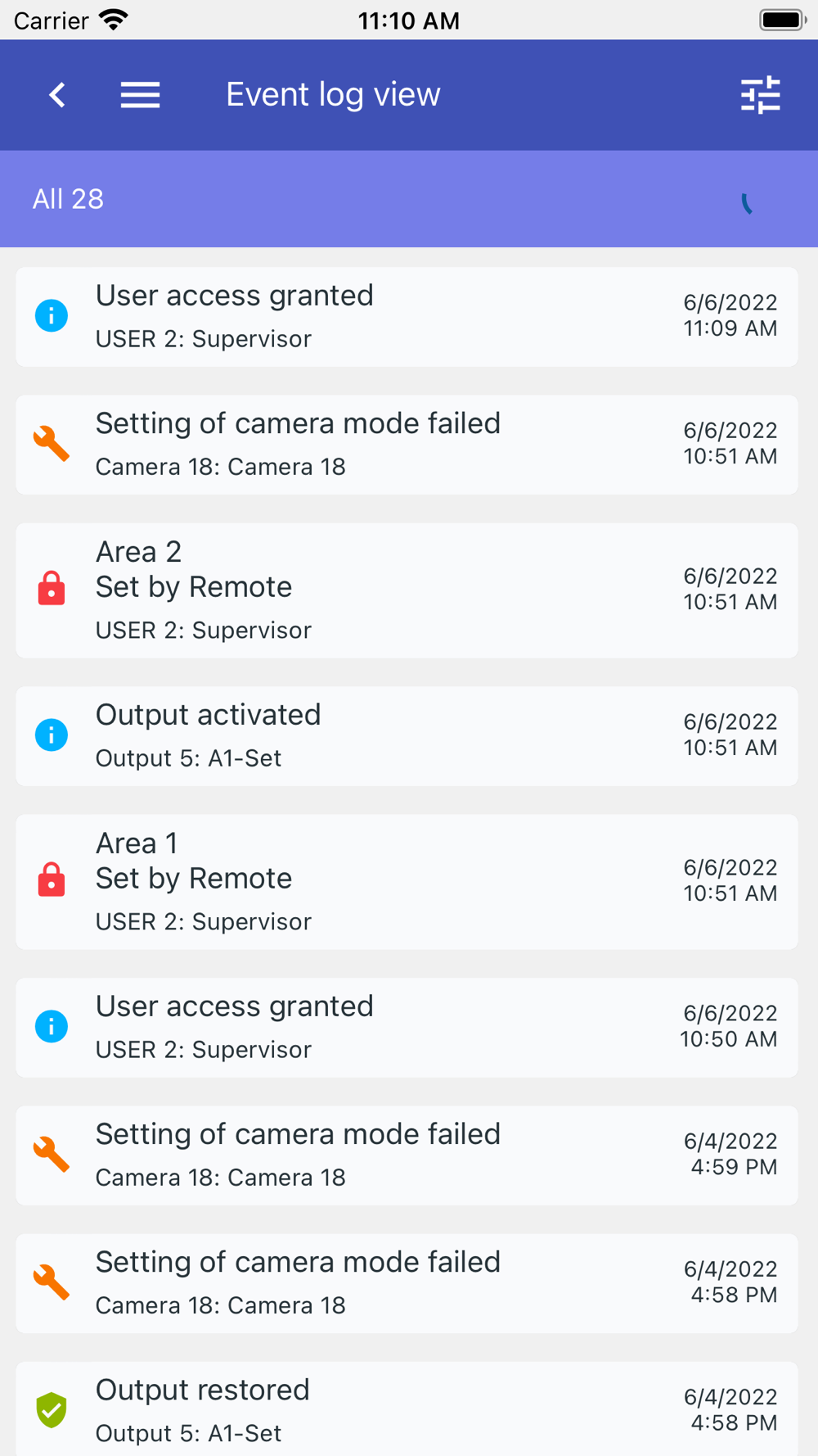 To consult the history of the events you can easily swipe to the event log page and scroll through the event list to check for example who armed the system at what time or when a door was opened to