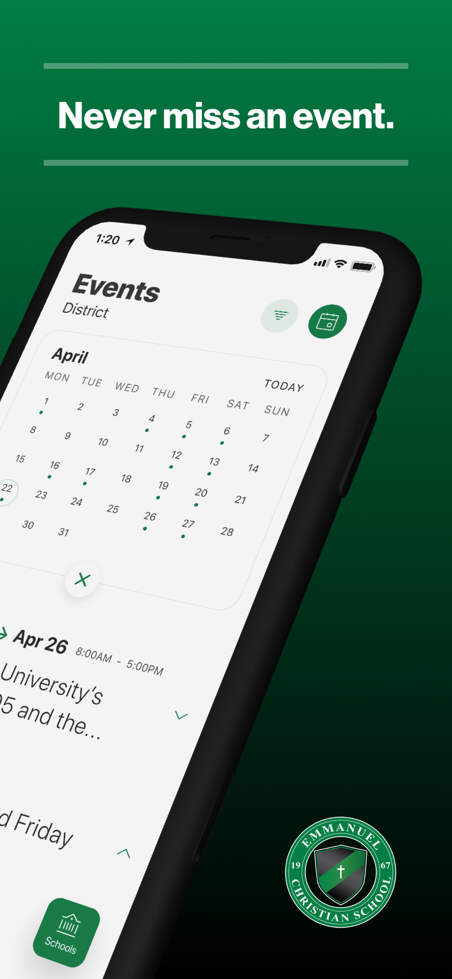 The event section shows a list of events throughout the district. Users can add an event to your calendar to share the event with friends and family with one tap.