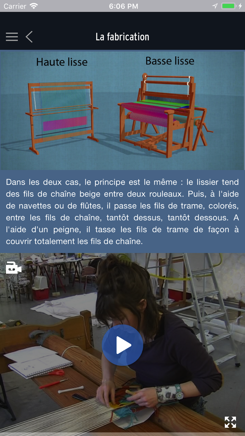 Après une introduction sur l’histoire de la tenture (frise chronologique), l’évocation de son sujet et de sa commande, l’application propose une vidéo pour comprendre les techniques de fabrication d’une tapisserie.