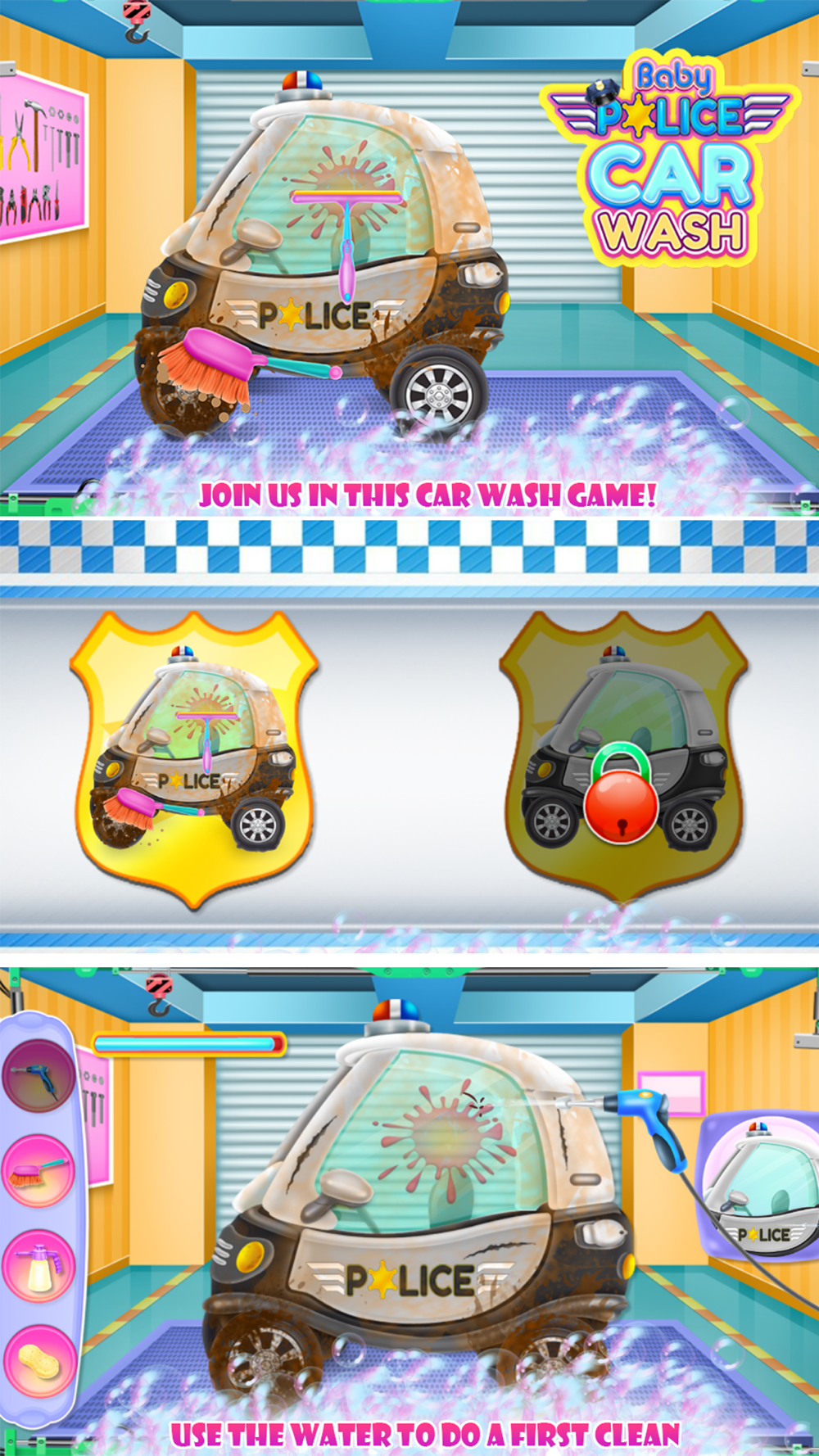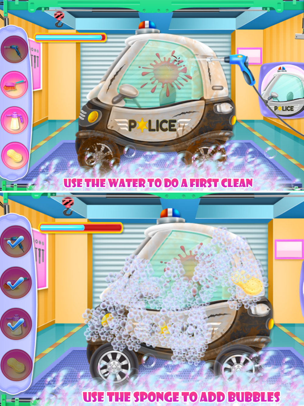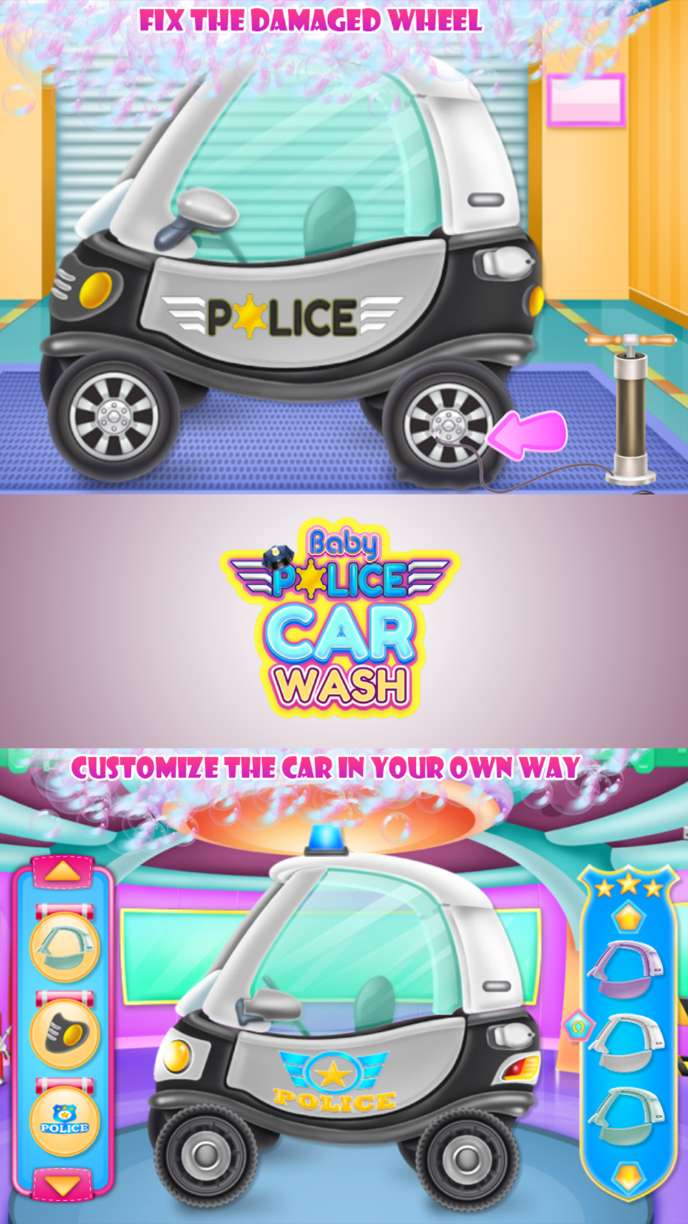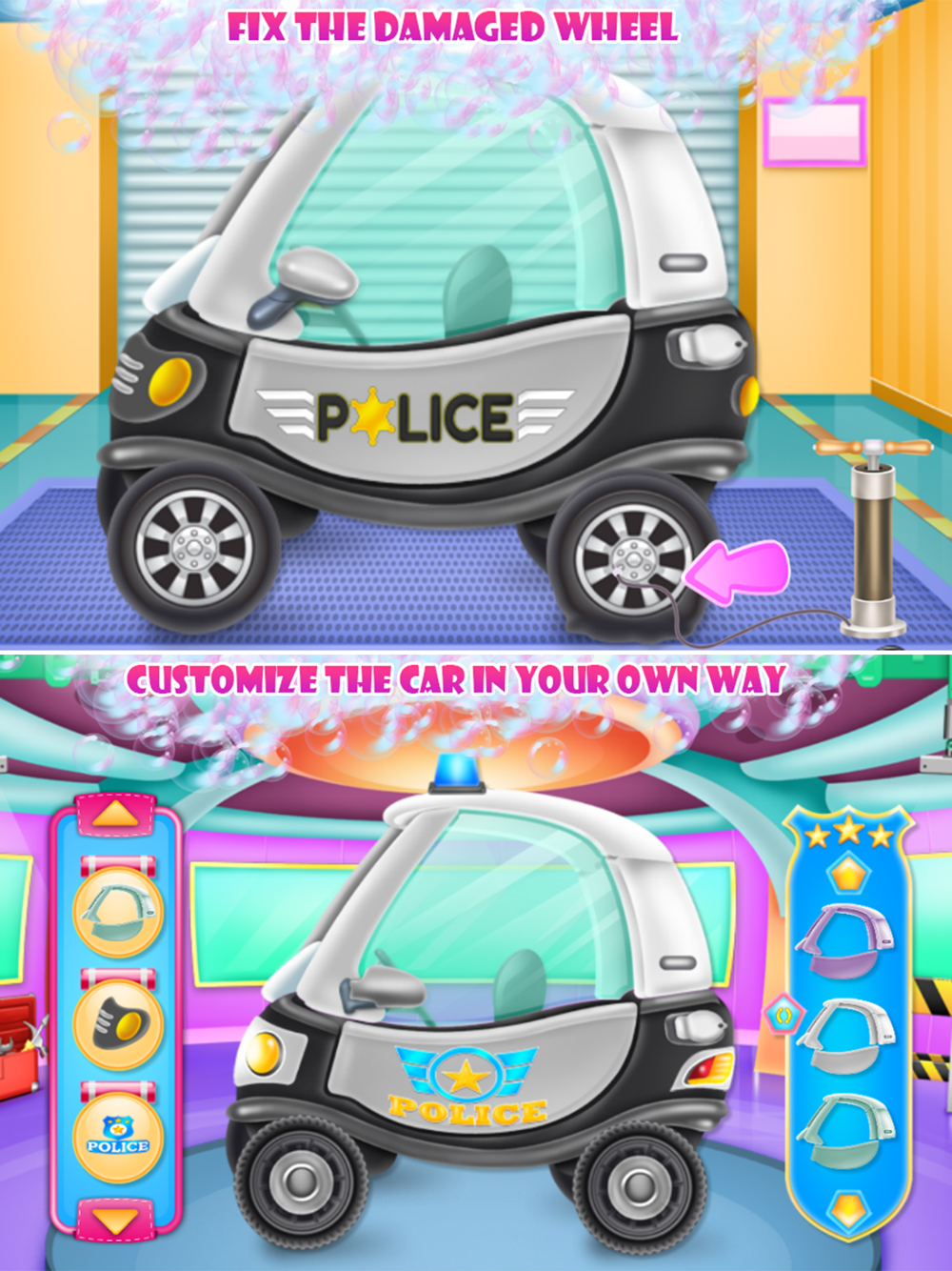 Seems like this baby police car needs your professional care and you are going to offer it in this cleaning game because you love your job and you want to have happy customers. So use the tools you have and try to make each task in the way it should be done. Wet it, add shampoo, rub the dirt and dry it all. Wash well the smutty window, add the missing piece and handle all those scratches that are spread on the car body. The broken wheel needs to be pumped and when you are done the only thing that is left is the polishing phase where you actually finalize the aspect of the vehicle. Move further to the designing step where you will use your own style to create a chich police car. Combine colors and textures, use your imagination and create a change in the aspect of the car, but don't be exaggerated when you combine colors so it will look perfect for the police car. Add some accessories to complete the attire, maybe some strangely shaped windows. Keep testing your abilities and try to add some innovative aspects to this car. You can have a lot of fun if you know how to handle this situation, be responsible and also try to learn the importance of a cleaned and all repaired car. After following the instruction you know exactly how a functional vehicle should look like and you could restore another one as well.