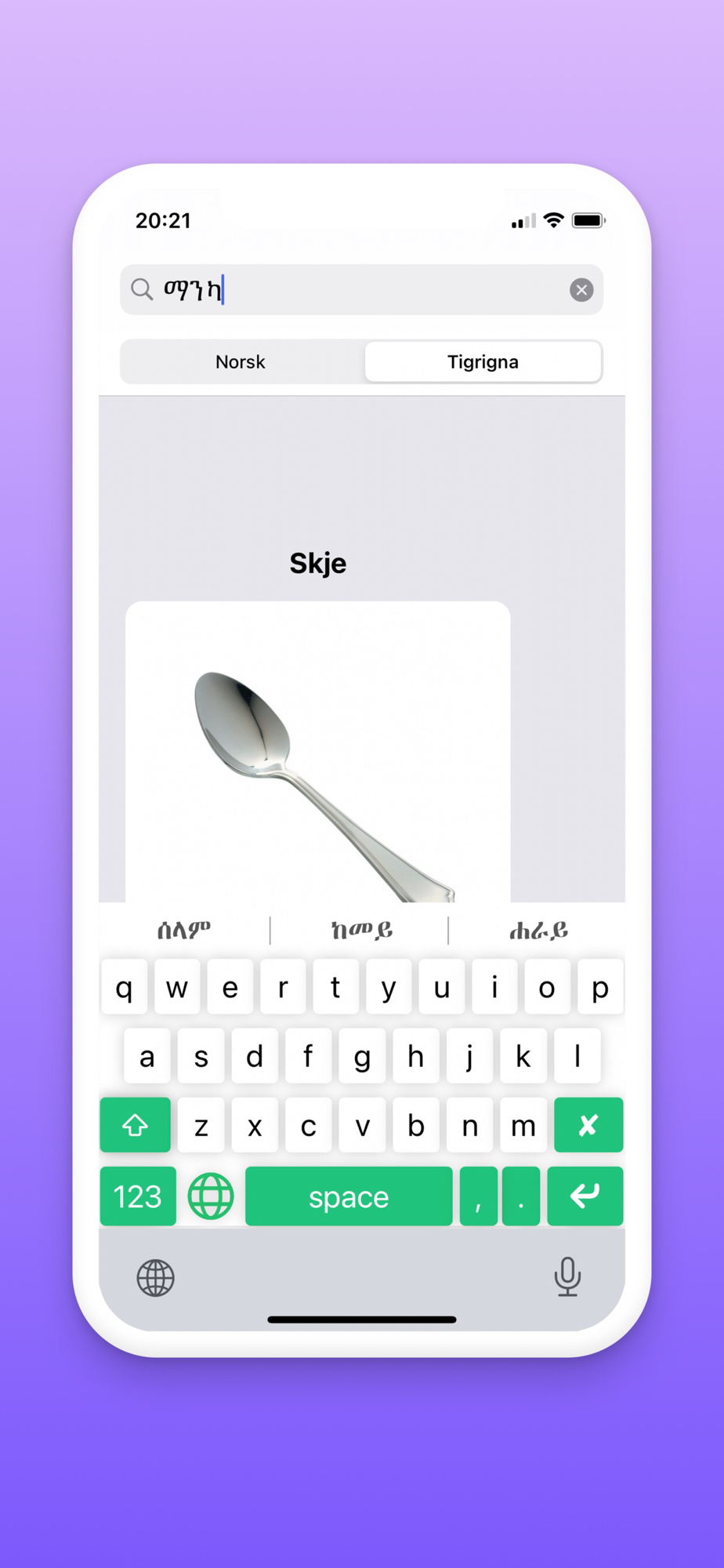 In this App you can see the name of the common foods, fruits, animals, colors, nature and vegetables spelled and pronounced in Tigrigna. The words are written in Norwegian and in Tigrigna.
