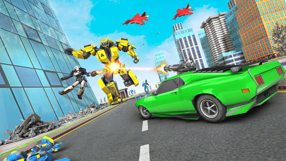The city is under attack by evil robots and this future robot games with jet robot simulator has a super robot transformation in the air with mech warriors. The terrifying destruction of the mafia has to be curtailed by transforming jet game of the week. The futuristic battle of airline police is here with super robots and ultimate plane to transform. Mech wars conquest has begun and the super robot transforming games is the best robot games in the world. The fly bot fighting is the ultimate machine build for war with dog fight battle in the air. The transform robot has to find the on ground mission for transform robot games or air robot games & fly robot games. You are part of the air police force in this flying robot simulator where you use all the ammunition with metal wings to shoot the enemy while being a transforming jet in mech fighting game. Earn victory and surge as savior with best controls of fighter jets & helicopters in transform robots. The air robots simulator with fly bot is the best police robot games available to play. Download the airplane robot games and fight the evil.