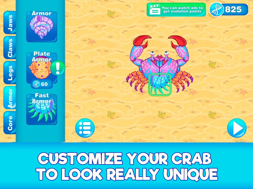 Beware of carnivores, chase herbivores - collect DNA to upgrade your crab and its abilities! Large pincers, hard spiked carapace, poison glands, even laser gun or power field – you can use all of these investments!
