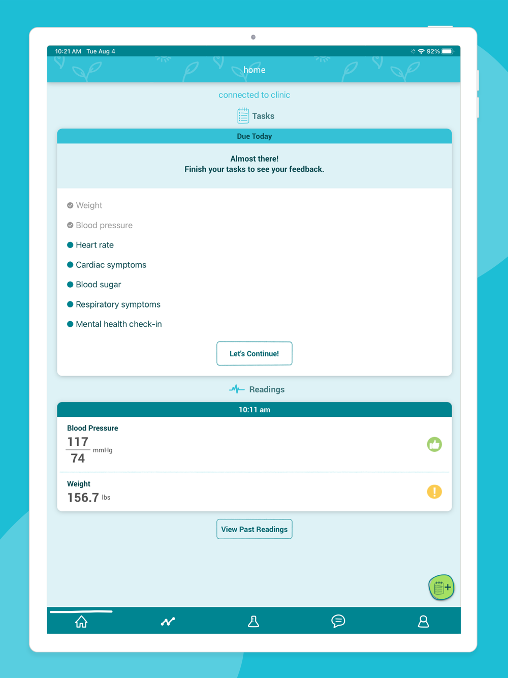 You can record data relevant to your condition(s) such as your weight, blood pressure, heart rate, blood glucose and/or symptoms. Medly interfaces with commercially available devices to capture readings and allows for readings to be entered manually.