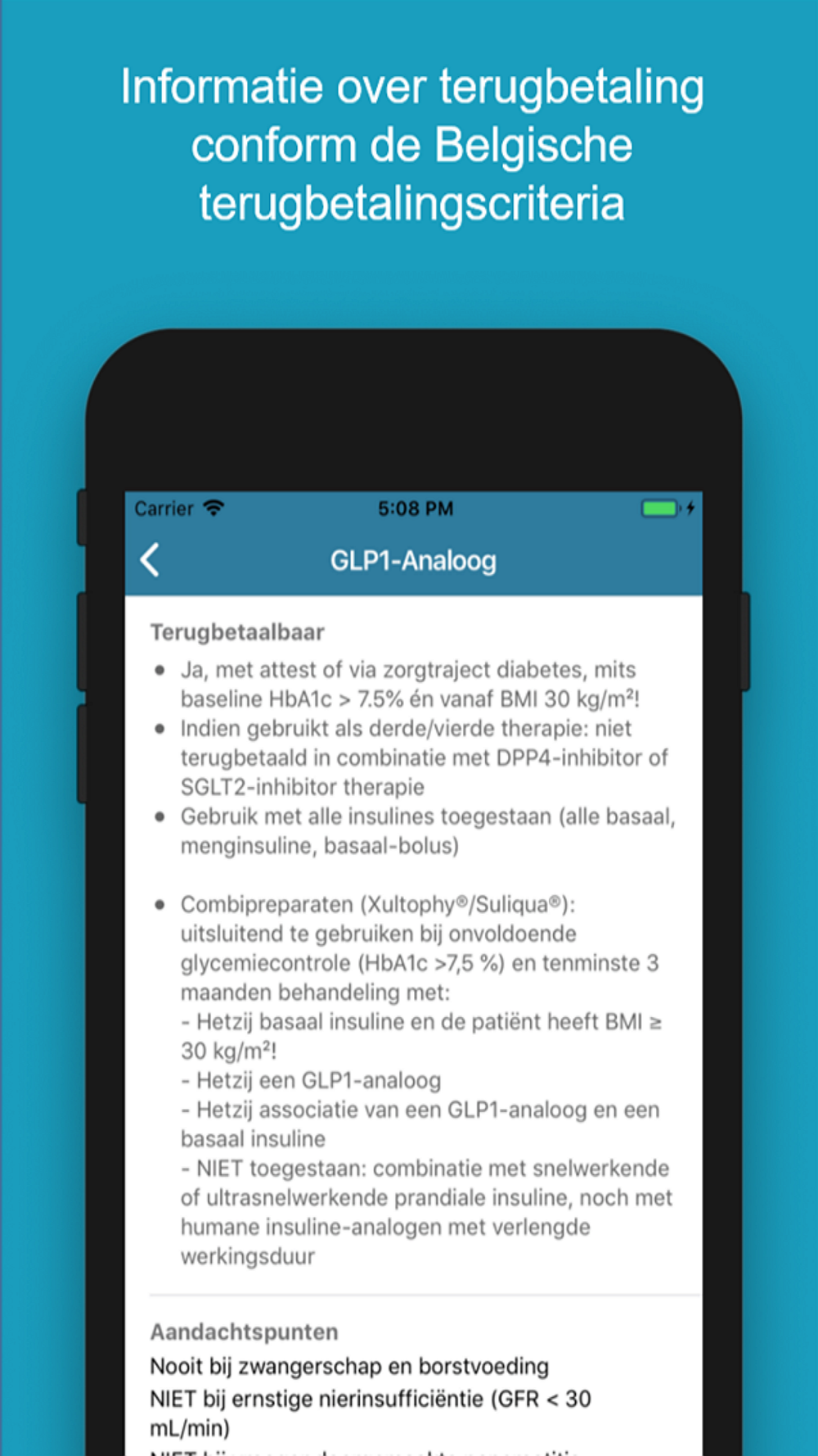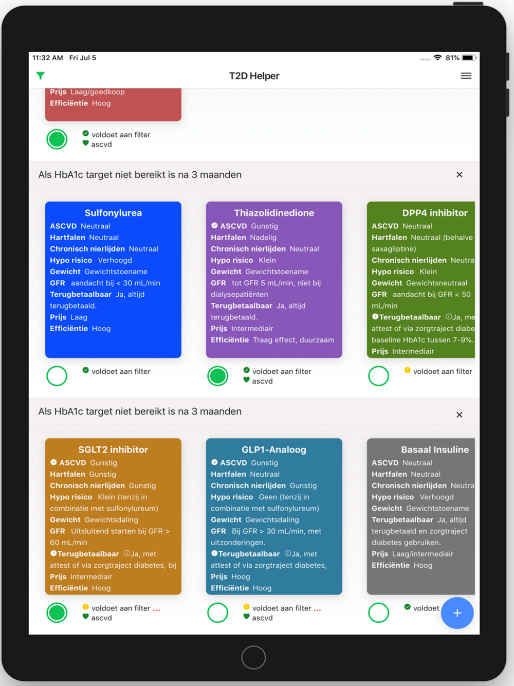 Bij de glucose verlagende behandeling van type 2 diabetes heeft de zorgverlener de keuze tussen verschillende klassen van geneesmiddelen. Het internationale EASD/ADA algoritme geeft raad voor het gebruik van de verschillende klassen van glucose verlagende geneesmiddelen. De "T2D Helper" is een app die informatie verstrekt over deze verschillende klassen van geneesmiddelen en die op een praktische manier het algoritme vertaalt naar de individuele patiënt, rekening houdend met co-morbiditeiten zoals atherosclerotisch cardiovasculair lijden (ASCVD), hartfalen, chronisch nierlijden en eventuele nierfunctie beperking. Bovendien kan de hulpverlener mogelijke nevenwerkingen van de therapieën zoals risico op hypoglycemie of de mogelijkheid van gewichtstoename/daling mee incalculeren door gebruik van de filters. Deze filters kunnen aan- of uitgeschakeld worden door de hulpverlener en zullen hem helpen om tot een geïndividualiseerde therapie voor zijn type 2 diabetespatiënten te komen. De "T2D Helper" app heeft bovendien een filter voor terugbetalingscriteria, zodat de zorgverlener onmiddellijk de therapie kan toetsen aan de Belgische terugbetalingscriteria en hij kan gebruik maken van aangeboden hulpmiddelen zoals terugbetalingsattesten. Uiteraard is de "T2D Helper" app slechts een ondersteunend instrument en is het de zorgverlener zelf die zal instaan voor de definitieve beslissing bij de keuze van de glucose verlagende behandeling. De "T2D Helper" app wordt op regelmatige tijdstippen geüpdatet in functie van de terugbetalingscriteria in België en/of bij wijzigingen in het landschap van de behandelingen bij type 2 diabetes. De formulieren nodig voor aanvraag van terugbetaling van de geneesmiddelen alsook de bijsluiters van de geneesmiddelen zijn beschikbaar in PDF-formaat.