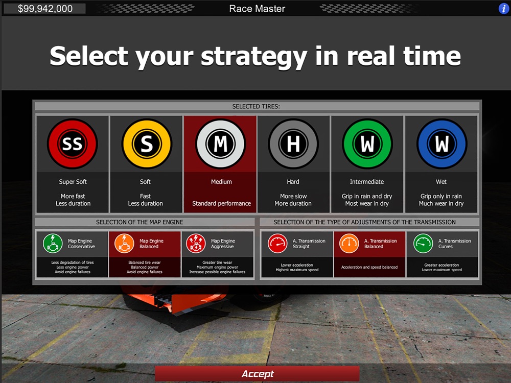 -Option of career strategy. In this menu you can select the Motor Map and the transmission settings for each circuit.