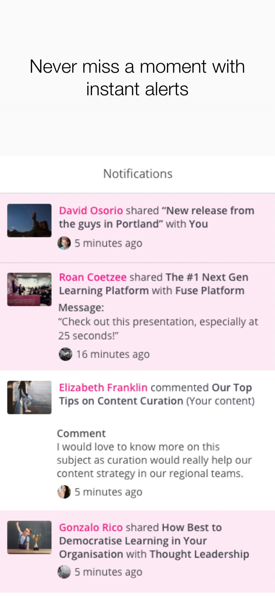 Share links, create articles, conduct coaching conversations and ask questions on the move. Gain instant access to all content through our enhanced search functionality directly in the app.