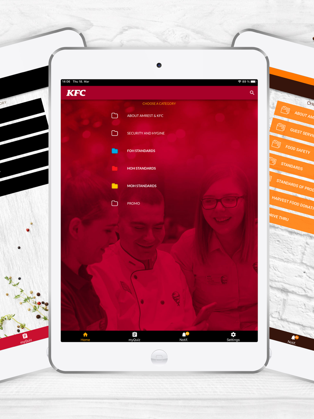 The app contains a knowledge base on standards applied in AmRest restaurants. Moreover, the app features the myQuiz game in which players answer questions related to AmRest, including standards-related questions.