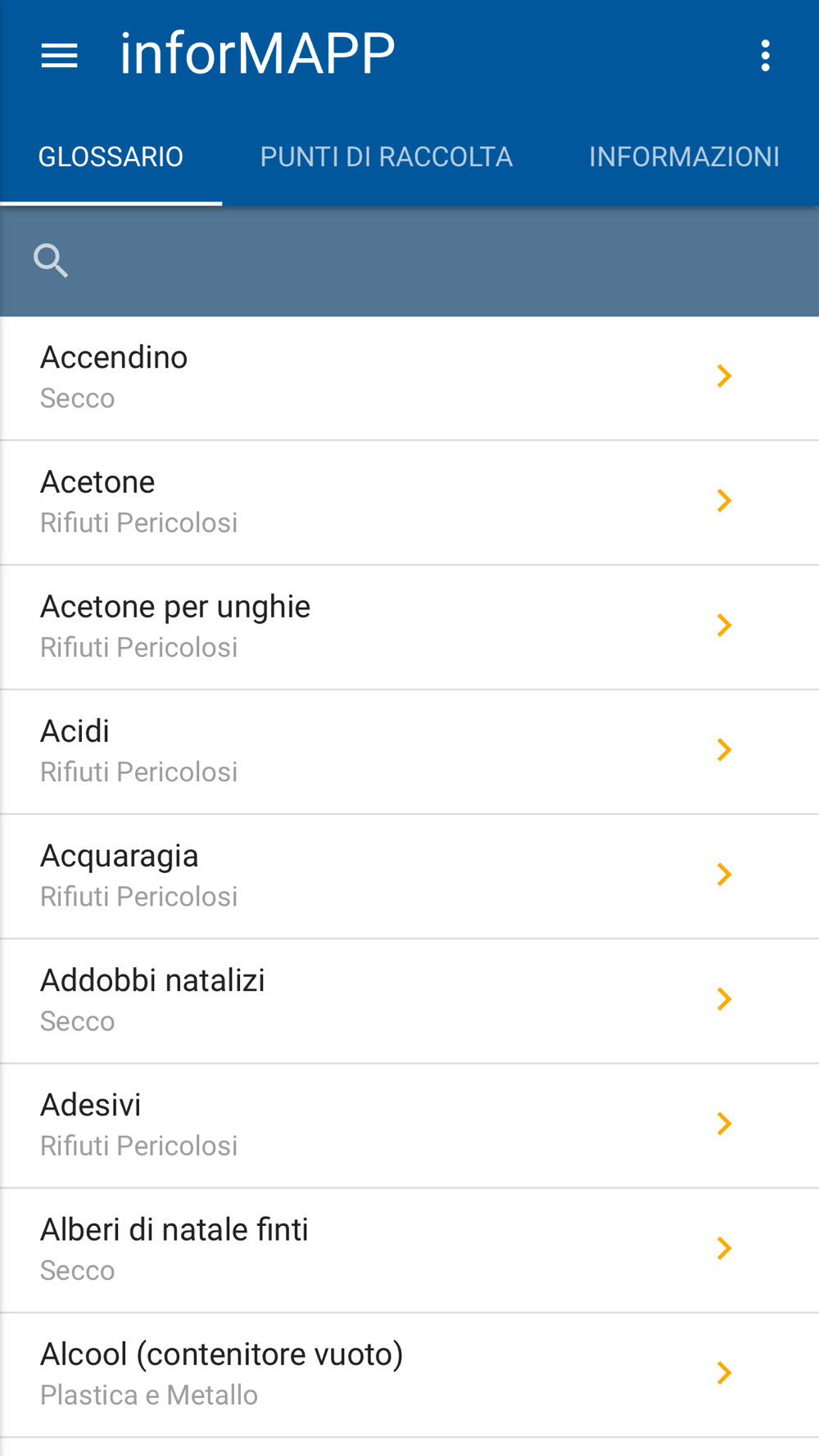 Glossario dei rifiuti per sapere in qualsiasi momento come conferire in maniera corretta il Tuo rifiuto. Visualizzazione sul territorio degli ecocentri, calendario digitale del porta a porta o delle informazioni generali di conferimento rifiuti.