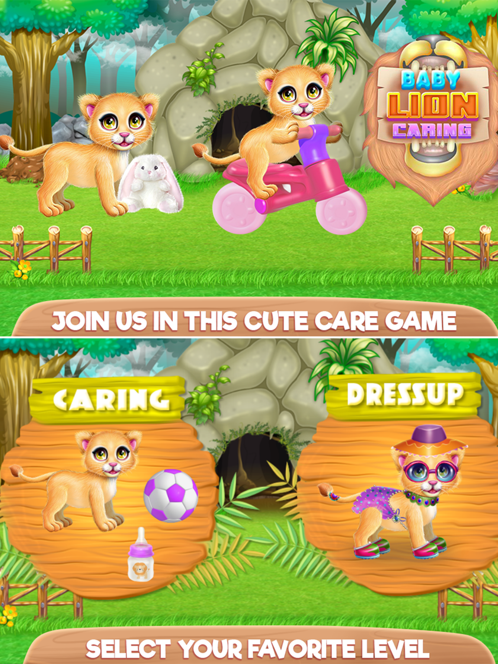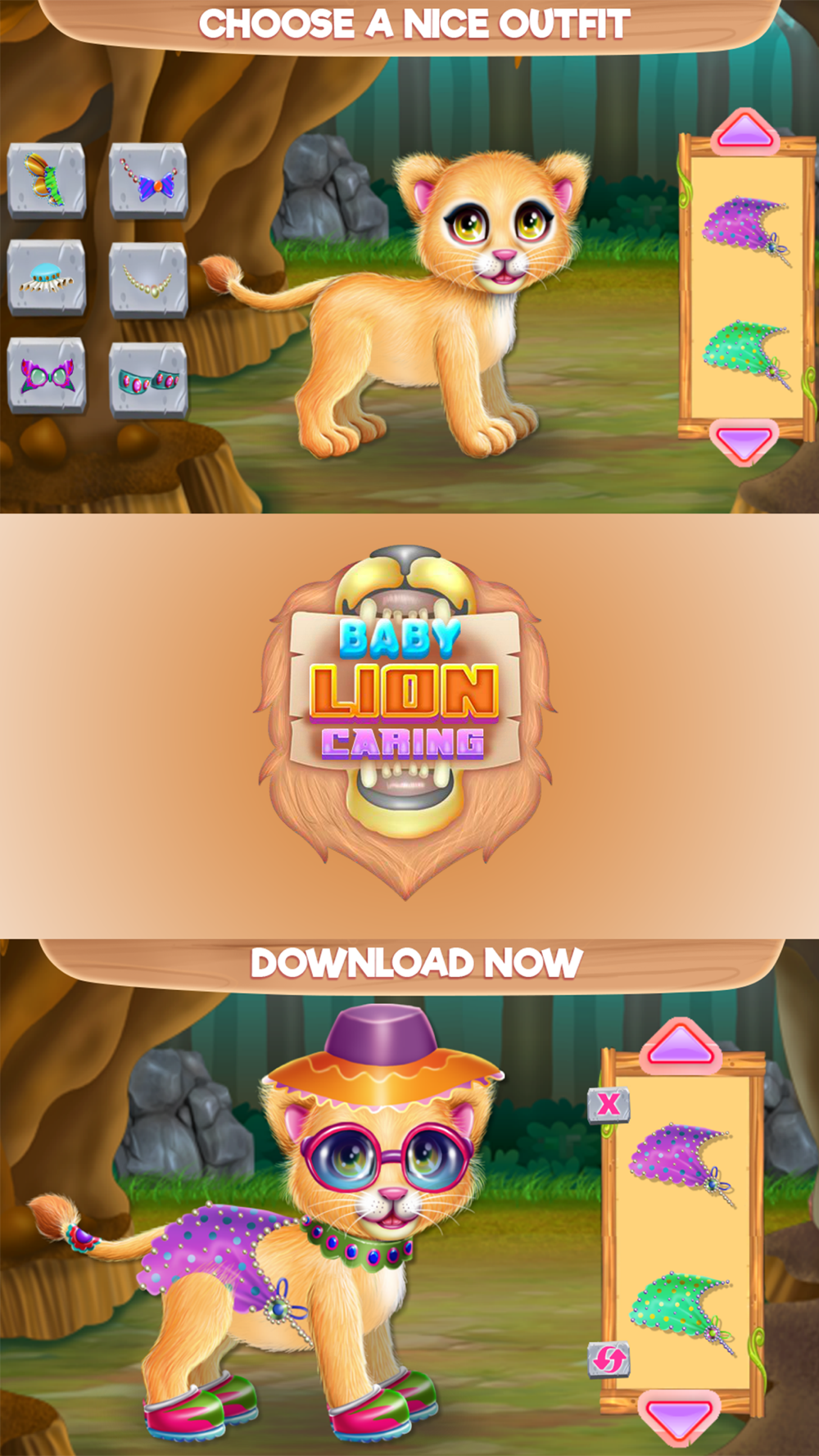 Have you ever dreamt of owning a lion? Well, now with this animal game you have the opportunity to understand how a baby lion should be taken care of. Make sure you fulfill each step and play with this baby as much as he asks. First comes the caring part and as you could see, there are many toys he is going to play with and after he is playing for a while he might be hungry and that is the time you are getting him a piece of meat. Try to entertain the lion and you might find yoursled having fun too. This particular game will offer an amazing opportunity to learn fun techniques and activities besides the beauty tricks all of them performed on a baby lion. Put all your talent together and try to find a way to give this little lion a pampering day where he can play as much as he want. Accomplish the care and playing challenges then keep going on with all the things that need to be done in order to please this baby lion. Now you have to take care of the dressing part where you add colorful pieces of clothing and interesting accessories to make him look even more full of life. Put on colorful accessories, add a nice outfit maybe you could even try to combine the look with your personal style. Do your best in this animal challenge and prepare your caretaker skills along with the designer ones because you are about to apply all those tricks you've earned in this game in others we've brought for you that are on the same area.