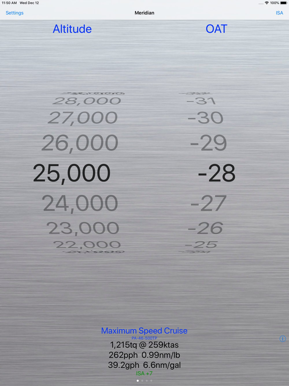 Utility for pilots of the Piper Meridian, M600, and JetProp DLX (-21 and -35) airplanes. Pilot enters altitude and outside air temperature; the app immediately calculates max speed cruise torque, true airspeed, pounds per hour, and NM/pound.