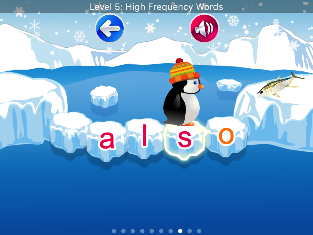 For sound out words, your child will learn 1,122 words that can be sounded out using common phonics rules (i.e, grouped by short vowel, long vowel, Bossy R's and other vowel team words), and others do not follow those normal rules and must be memorized (i.e, beard, climb, flood, great, snow, world). This app also uses phonics to help your child learn new words by putting sounds together to make words (like /b/ /a/ /t/ bat). So your child will be able to read and write words correctly without memorizing. In this game, your child will help Snow the polar bear reach an iceberg to catch fish. Each correct letter chosen adds a block to his bridge. Finish the word and Snow can cross, but watch out for wrong letters, or Snow will take a dip! This is the fun game to improve your child's spelling abilities.