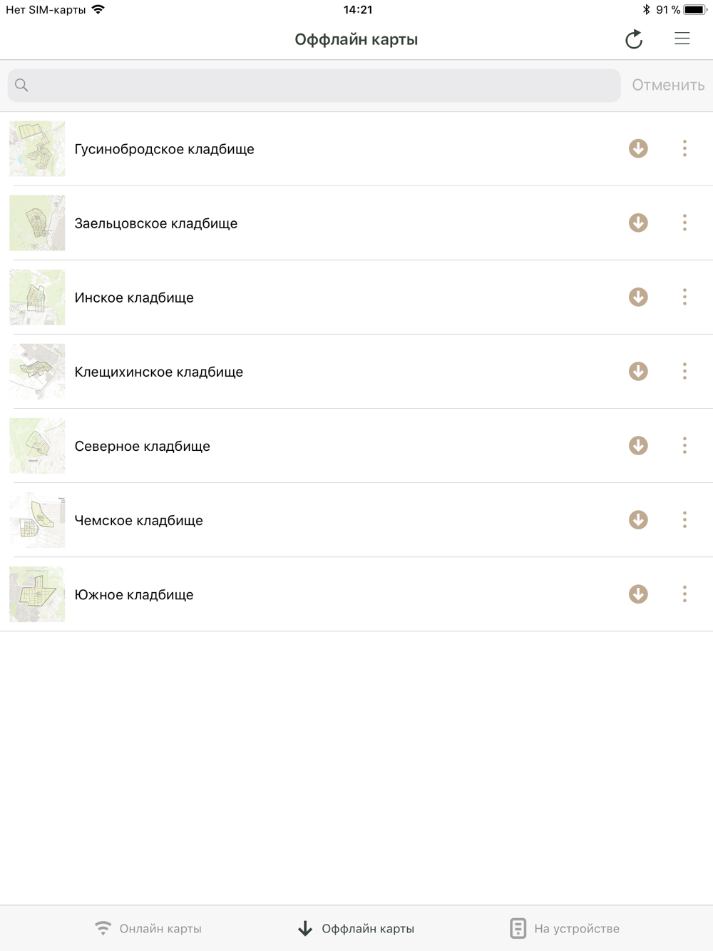 The app is provided for work with electronic online and offline maps of the following Novosibirsk cemeteries: Chemskoye, Gusinobrodskoye, Inskoye, Yuzhnoye, Kleschikhinskoye, Zayeltsovskoye, Severnoye.