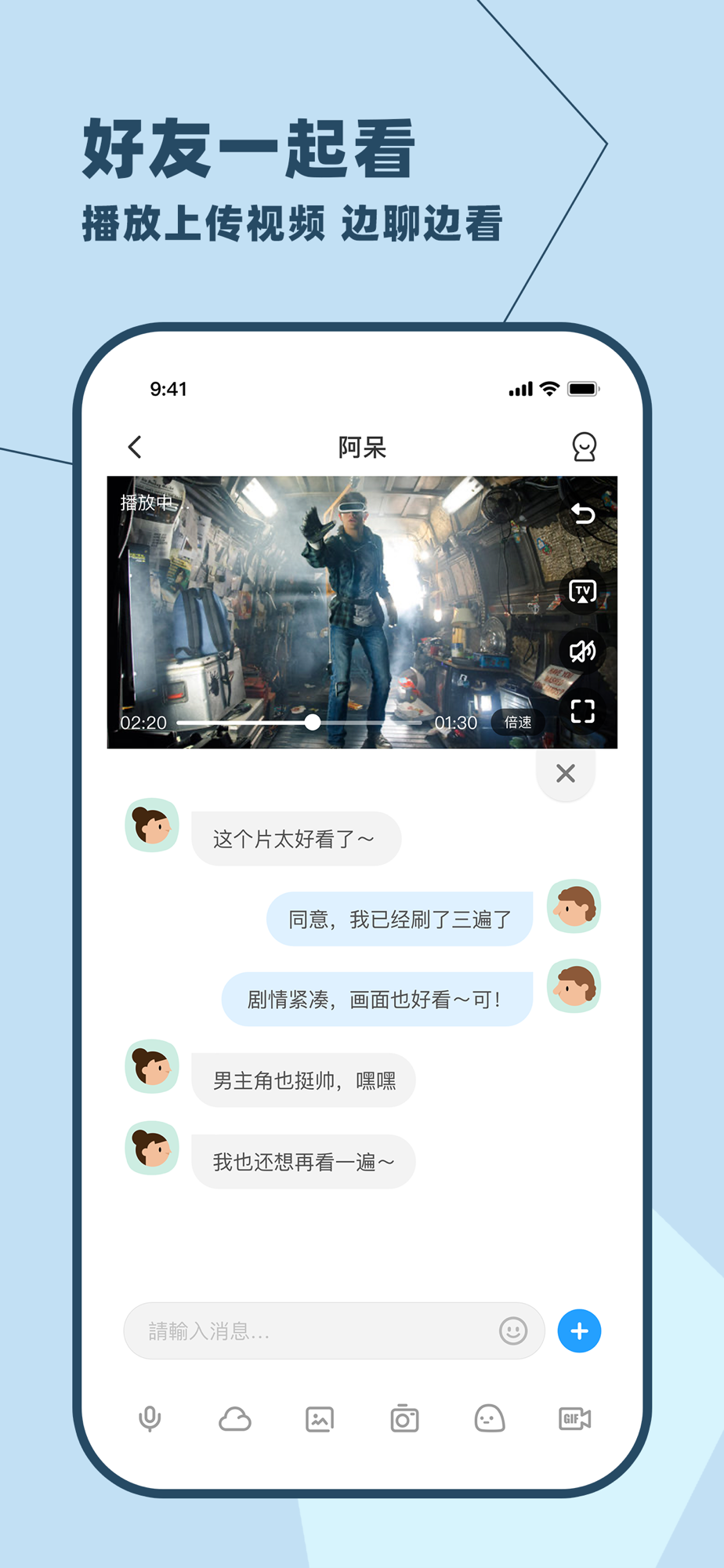 ·聊天内置小应用“一起看”,同屏同步播放,支持M3U8视频流。