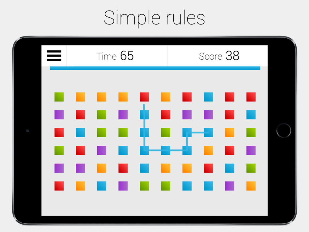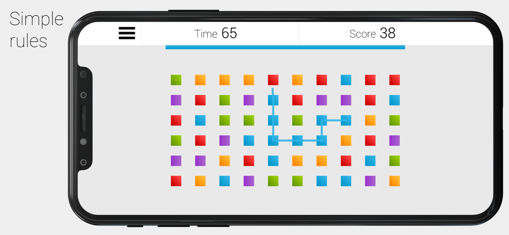 Connect the squares of the same color (top, bottom, left or right). Depending on how many squares you combine, you will get so many points. If you close the loop, your points will be multiplied. In addition, if you play in "move mode", the remaining numbers of moves will not be reduced.