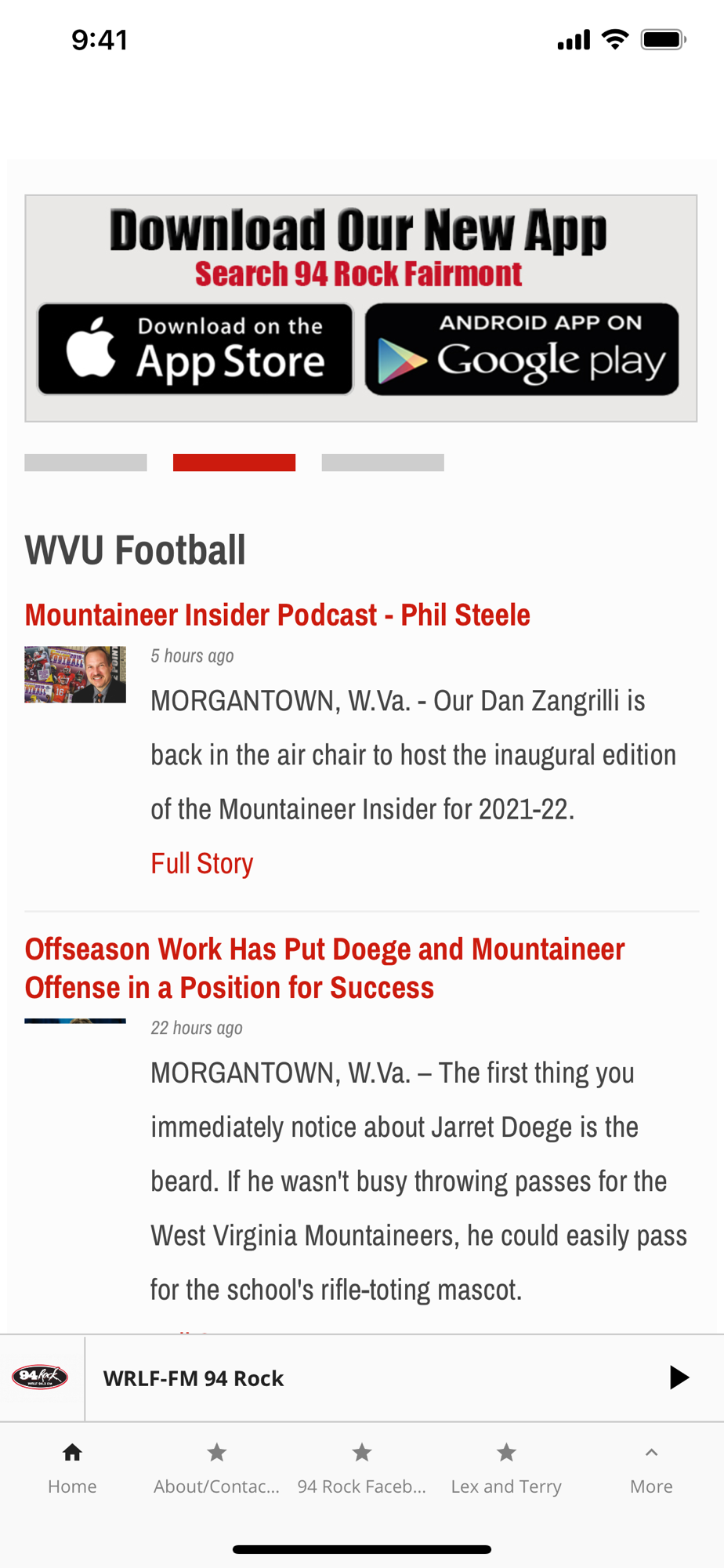 94 Rock (94.3 FM - WRLF) plays the best rock hits of the 70s, 80s, and 90s. 94 Rock is also the home of The Bob and Tom Show and West Virginia University football and basketball in Fairmont! Plus, we have East Fairmont High School football, boys and girls basketball, and we’re Marion County’s home for the Pittsburgh Steelers. 94 Rock FM is licensed to LHTC Media of West Virginia, Inc. To learn more about LHTC Media and its affiliates, visit www.lhtcmedia.com.