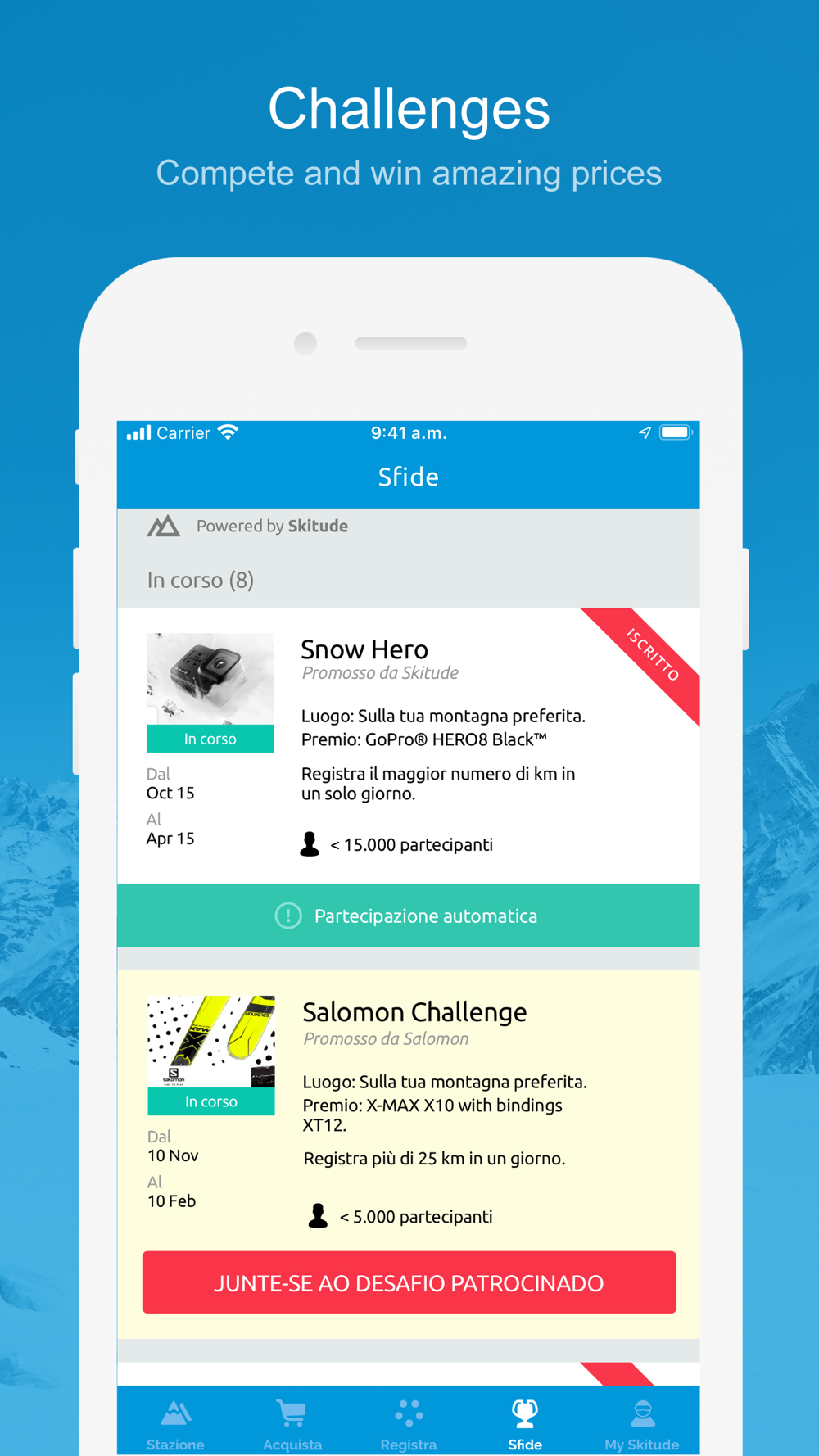 The App offers a range of features designed to optimize your experience before, during and after your trip. It’s very simple, plan your getaway and get real time updates on slope conditions. Set up your Skitude profile and track your activities on the slopes to get detailed stats about all your activities. And that’s not all, take part in challenges competing with the whole community, to be in with a chance of winning incredible prizes.