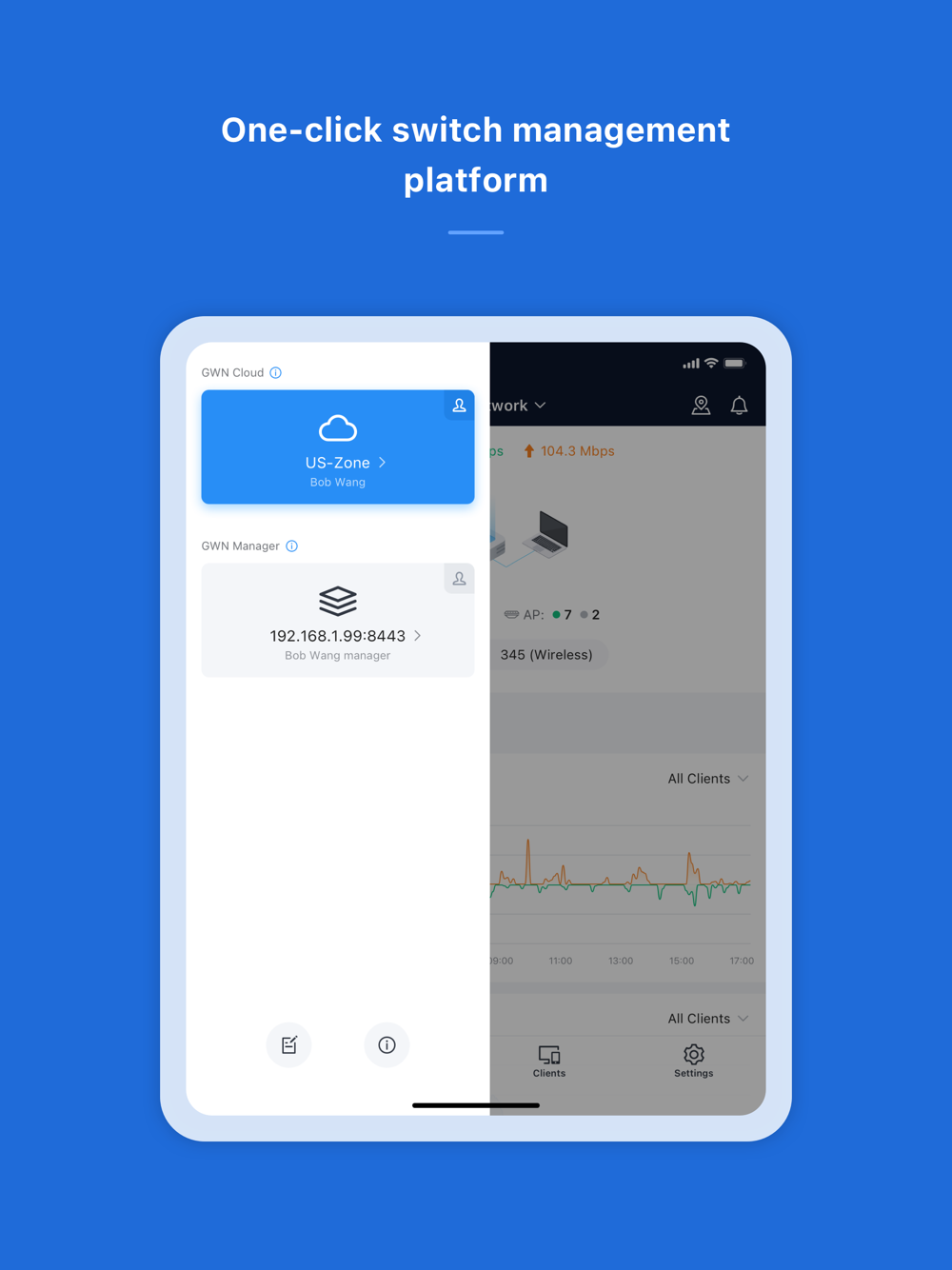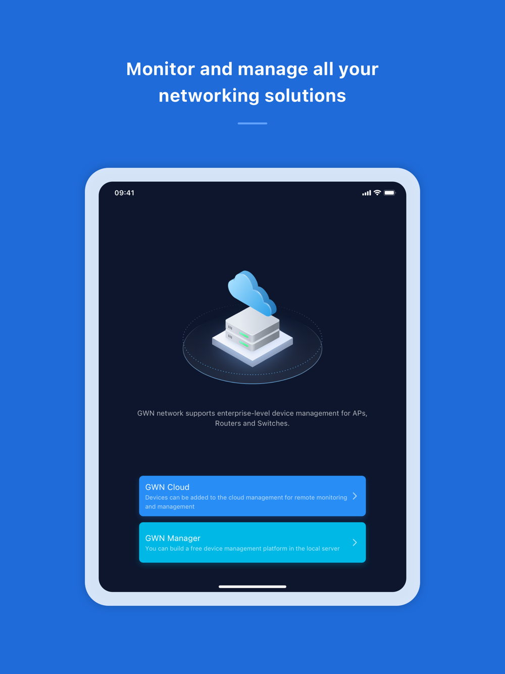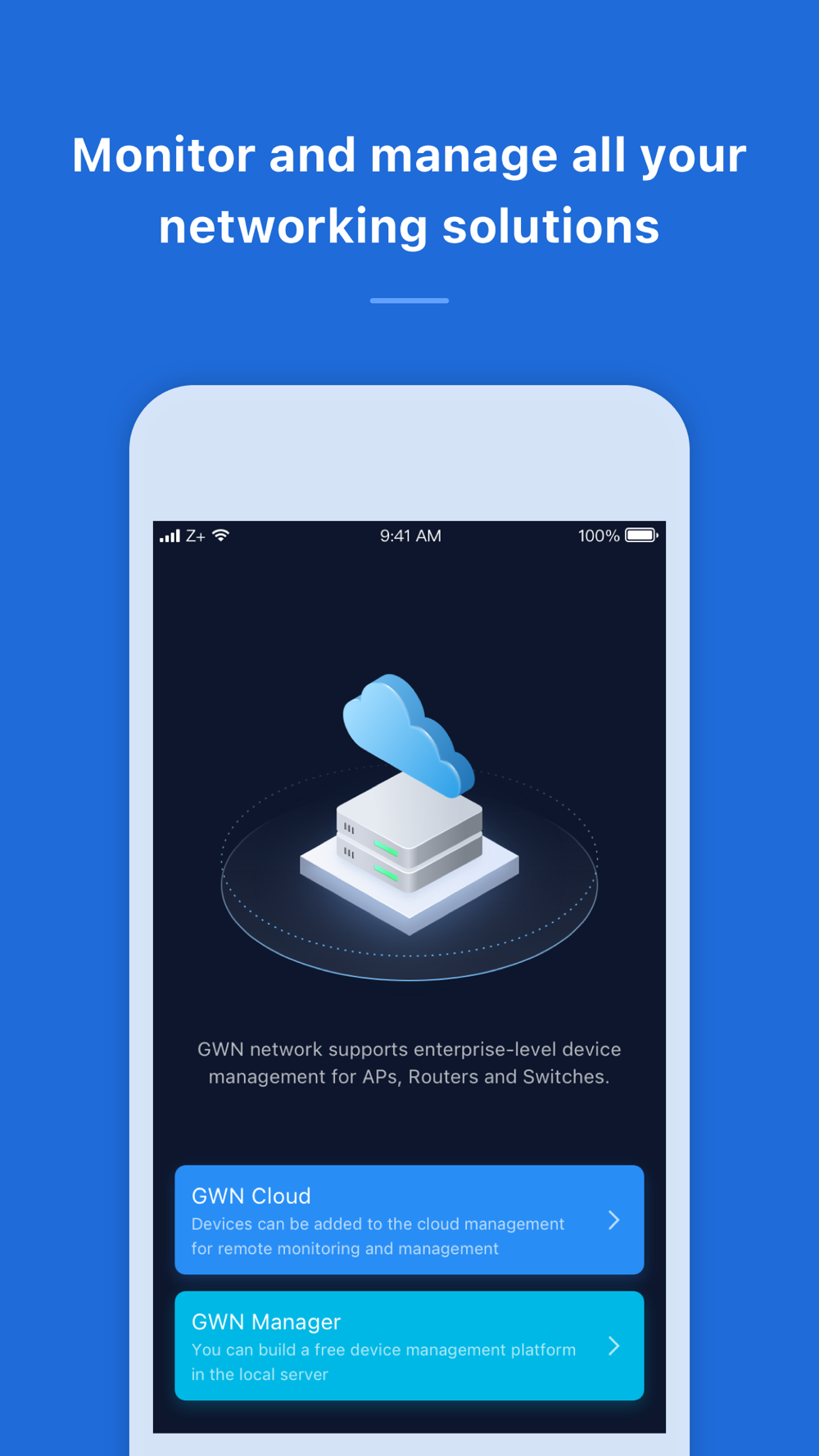 Manage the network-based devices at anytime from anywhere using iOS phone with the GWN app. This free app links seamlessly with devices registered in GWN.Cloud or GWN Manager, and allows users to conveniently monitor and manage the network established by GWN devices. The GWN app extends web features to iOS phone to allow you to manage the network and be productive while on-the-go: monitor network/device/client status in different time periods, notify alert information once alert event occurs, add device to the network via phone camera scanning or manually fill in device MAC and its corresponding password, monitor device details including usage and other information, support debug tools for problem-tracking, configure your network as well as devices according to your needs, and much more. There is no purchase necessary to manage the network-based devices with the GWN app.