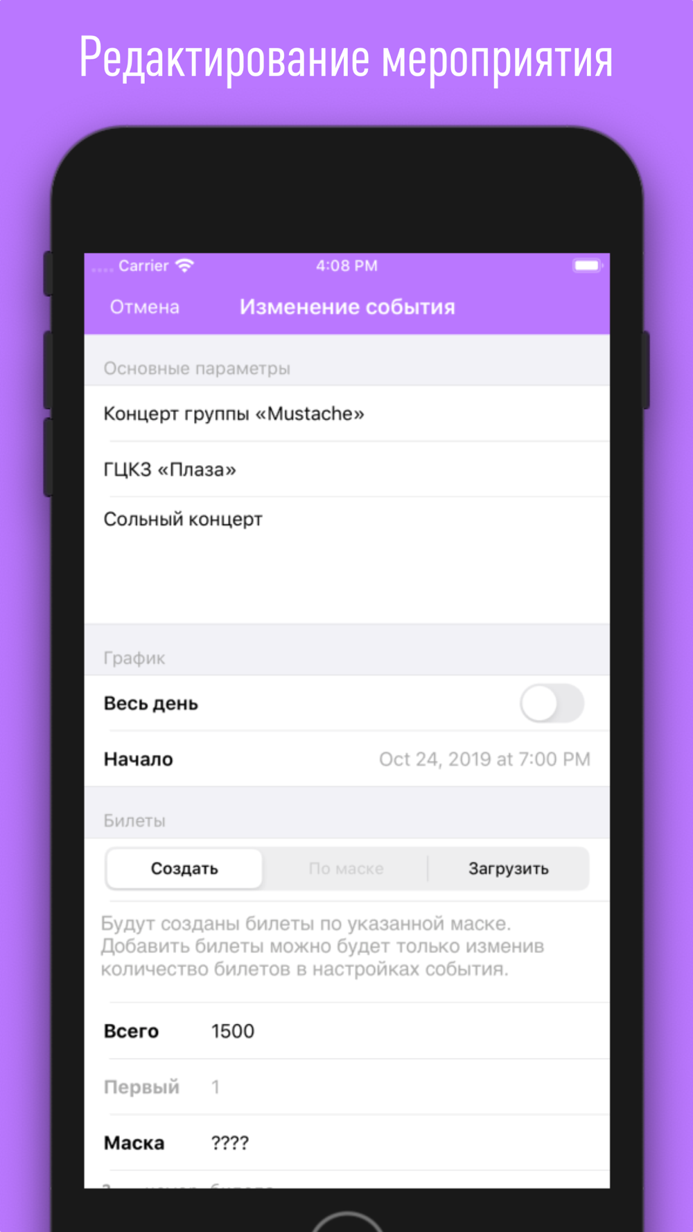 - Создание билетов по маске или загрузка готового списка билетов;