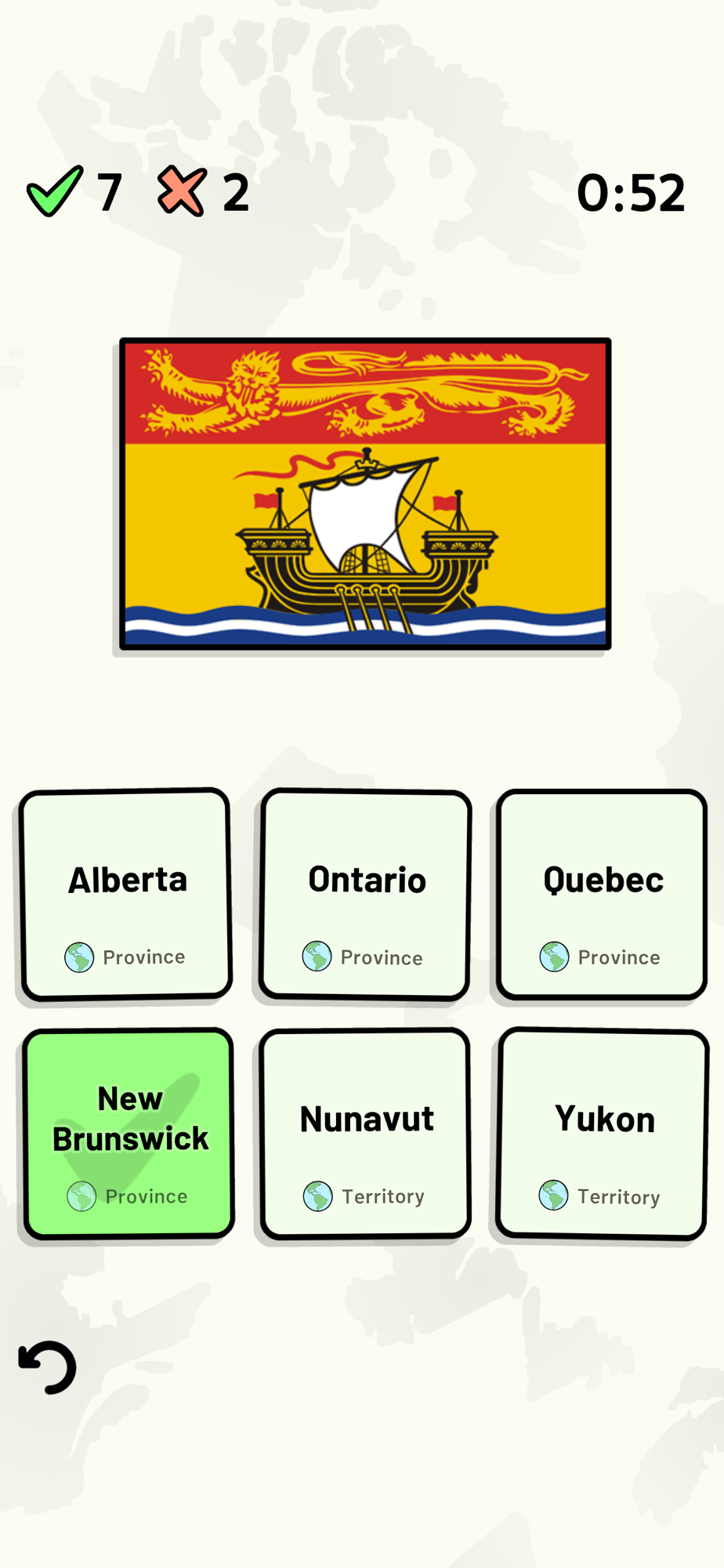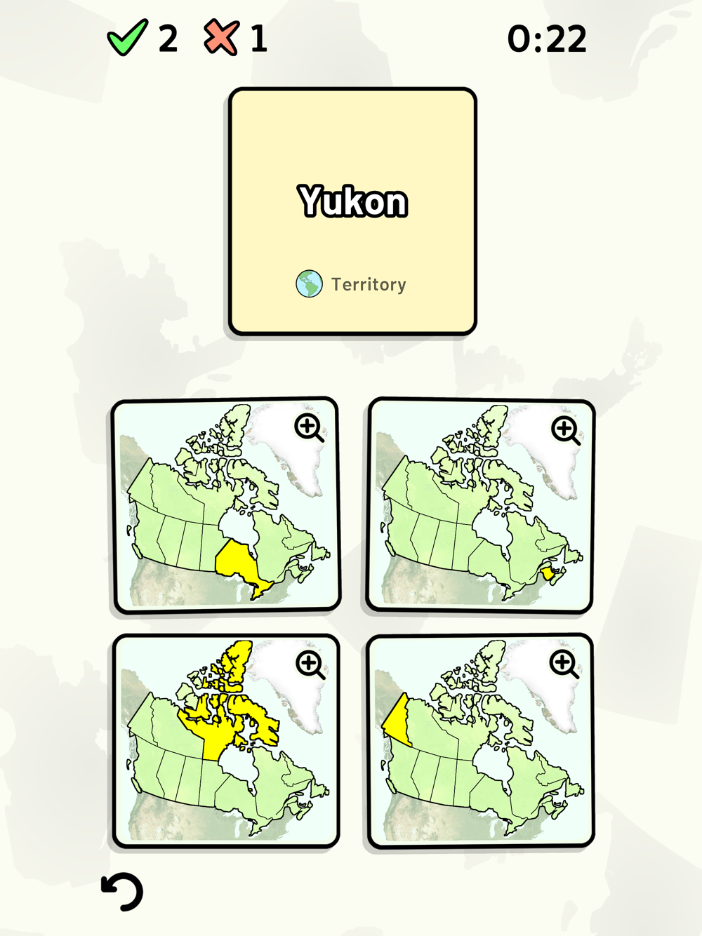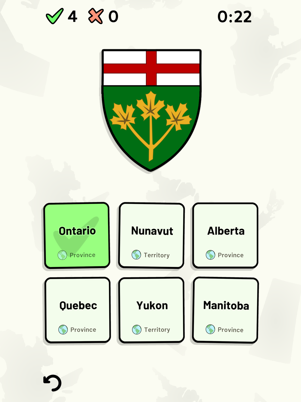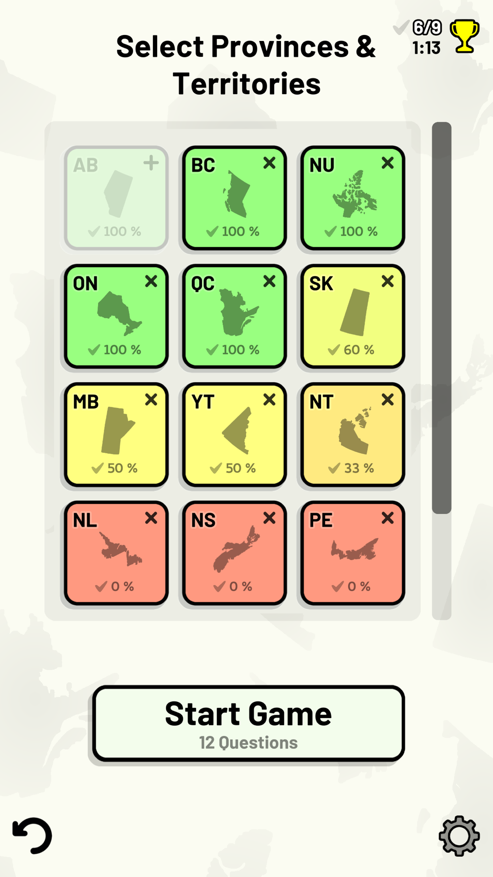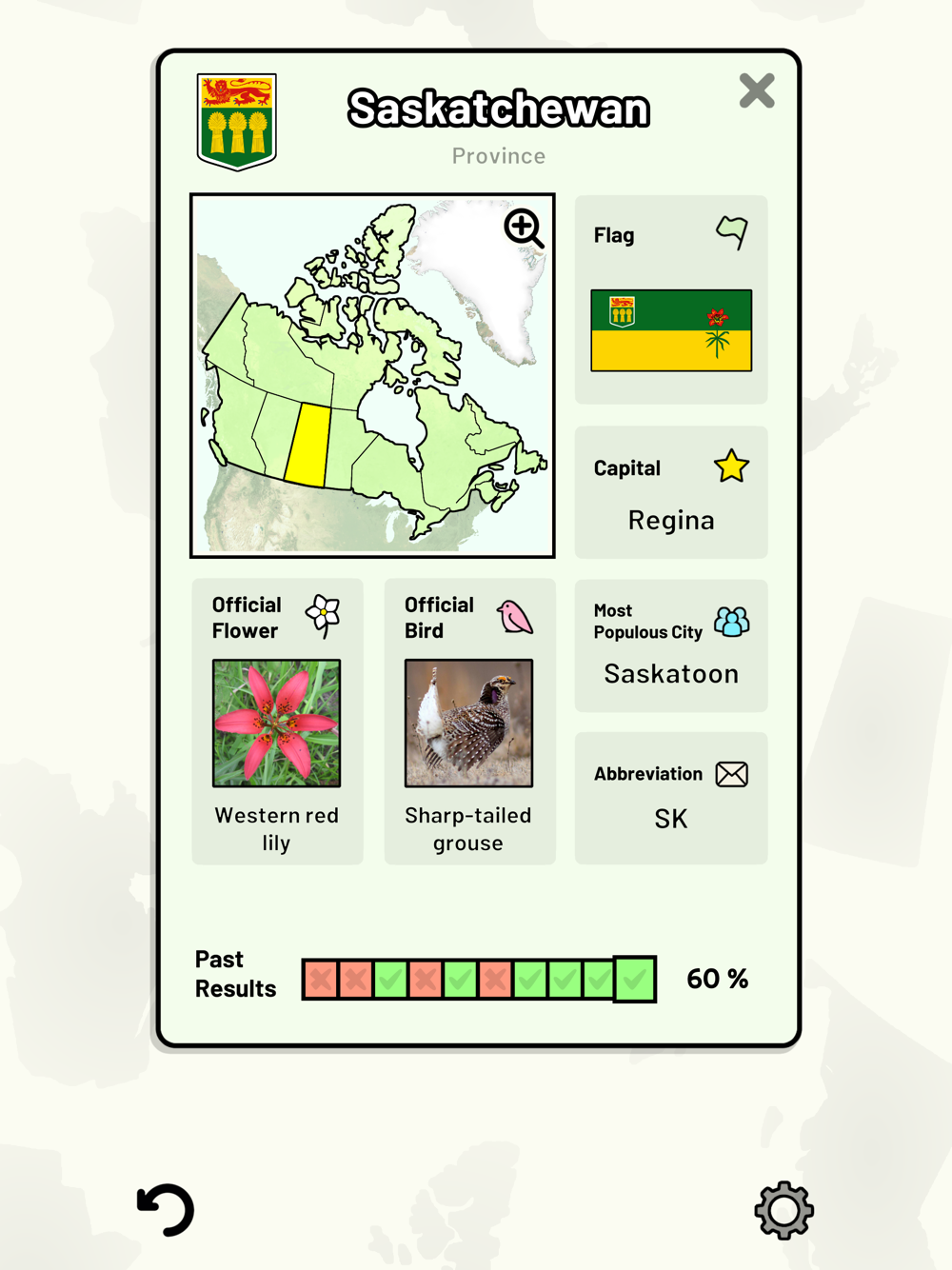 Customizable quizzes allow you to choose which provinces and territories to test, as well as the topic. Past results for each province and territory are displayed to highlight your progress on each topic.