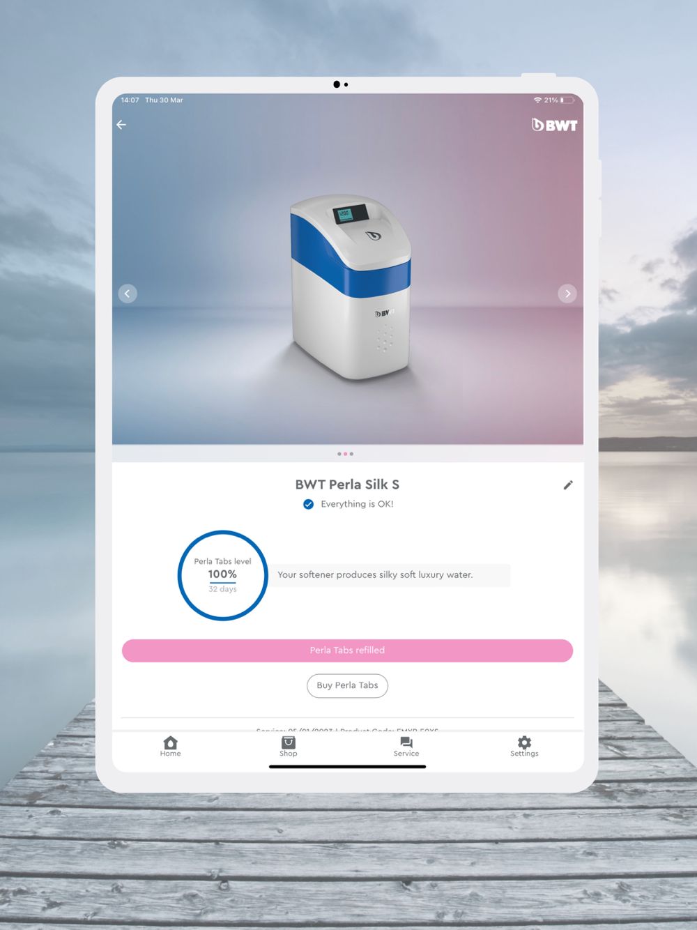 From now on, everyone who does not own a BWT Perla will also benefit. They can also use the BWT Best Water Home App and receive notifications about their registered products (such as water filters, limescale protection systems, water dispensers, pool tester kits and table water filters) conveniently on their mobile phones and order suitable consumables online.