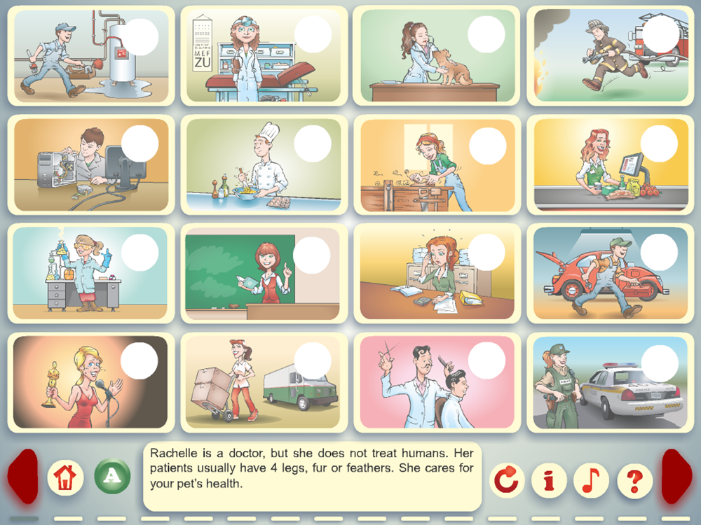 The exercise presents sixteen drawings of sixteen descriptions of a character and his job. Each text scrolls horizontally across the screen alongside the sixteen drawings. The job which corresponds to the description must be identified by a letter. Once the job is found, the letter must be slid above it. If the answer is correct, a signal appears. Otherwise, the player passes on to the next text or the game has to be restarted. Once all sixteen drawings have been identified and each letter is in place, the game is complete.