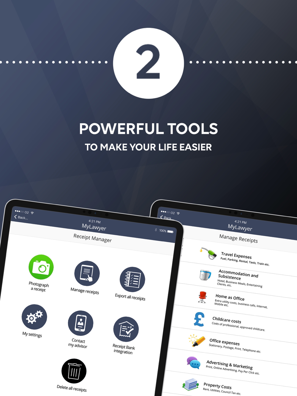 Say goodbye to paper receipts, our App allows you to photograph your originals, quickly categorise them and export them in a spreadsheet format, ready to send to your lawyer or CPA whenever suits you. Never again will you have to worry about losing a receipt or taking up valuable office space with piles of paper.