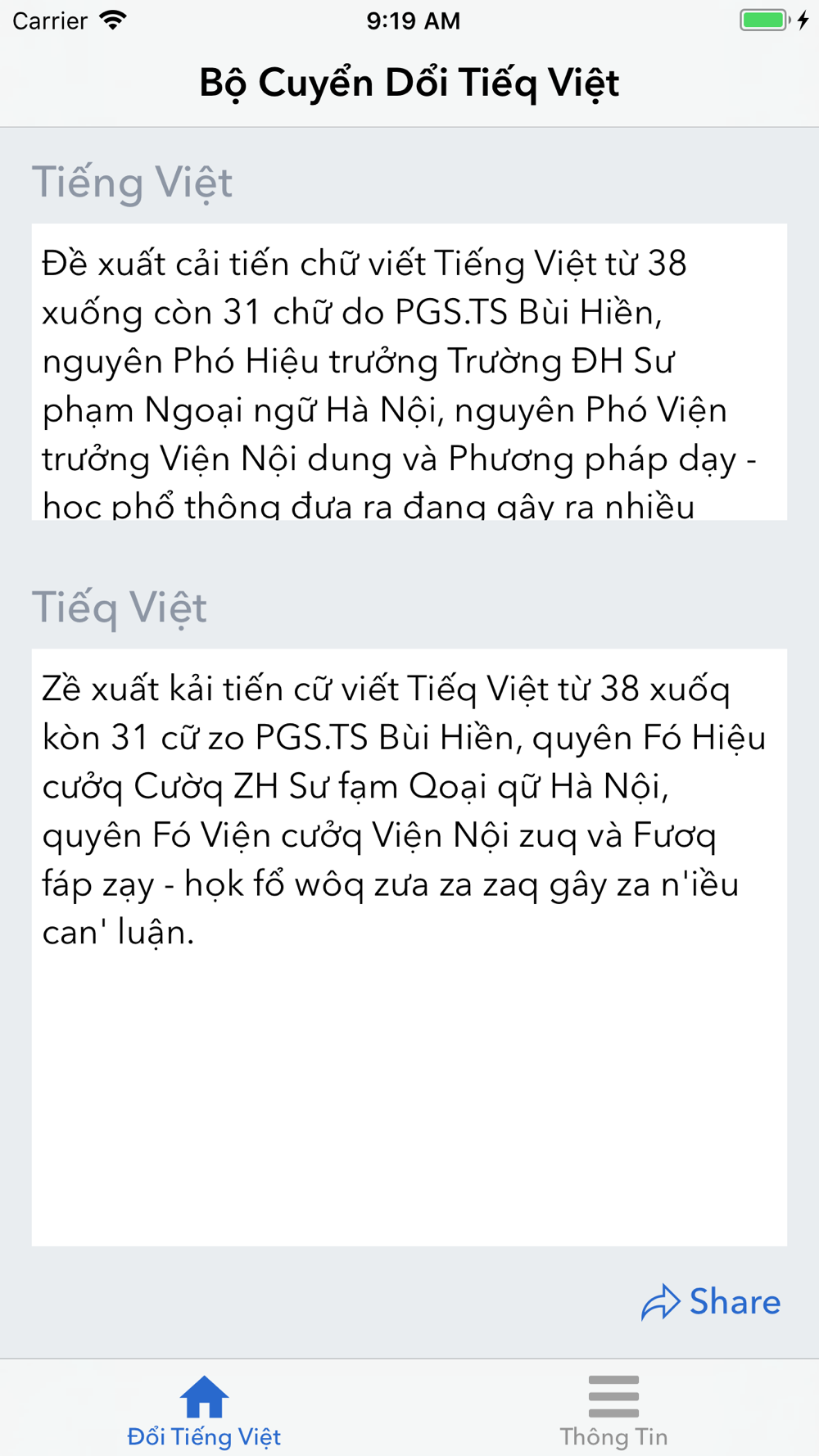 Ứng dụng chuyển đổi Tiếng Việt - Ứng dụng chuyển đổi 'Tiếng Việt' thành 'Tiếq Việt'