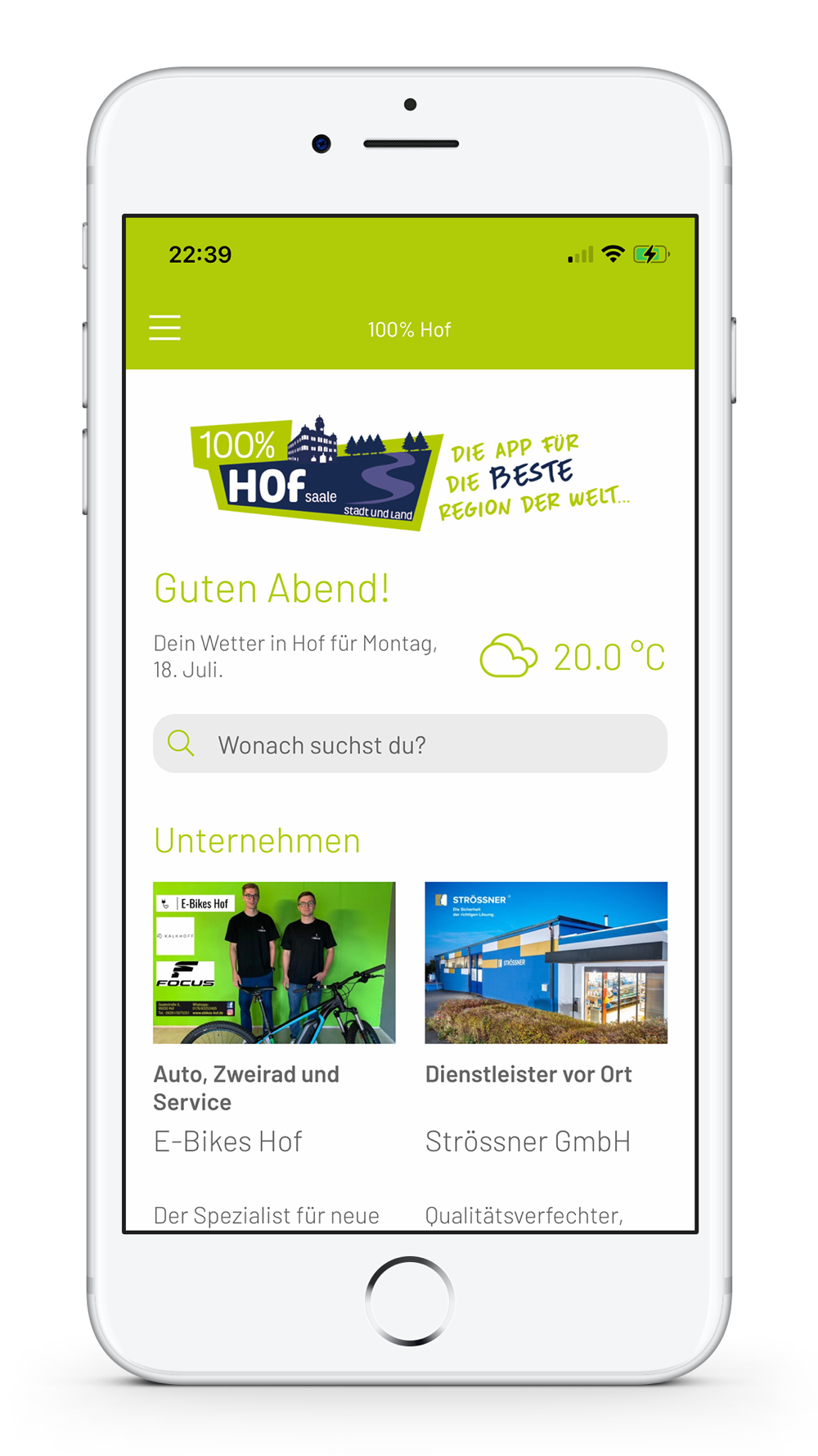 Mit der 100% Hof App bekommst Du genau die Infos und Tipps, die Du brauchst – und zwar zu jeder Tageszeit: morgens alle brandaktuellen Neuigkeiten aus Hof, zur Mittagszeit passende Restaurant-Locations für Deine Mittagspause und zum Feierabend gibt es Konzerte, Kinobesuche oder spannende Ausgehtipps in der Region Hof.
