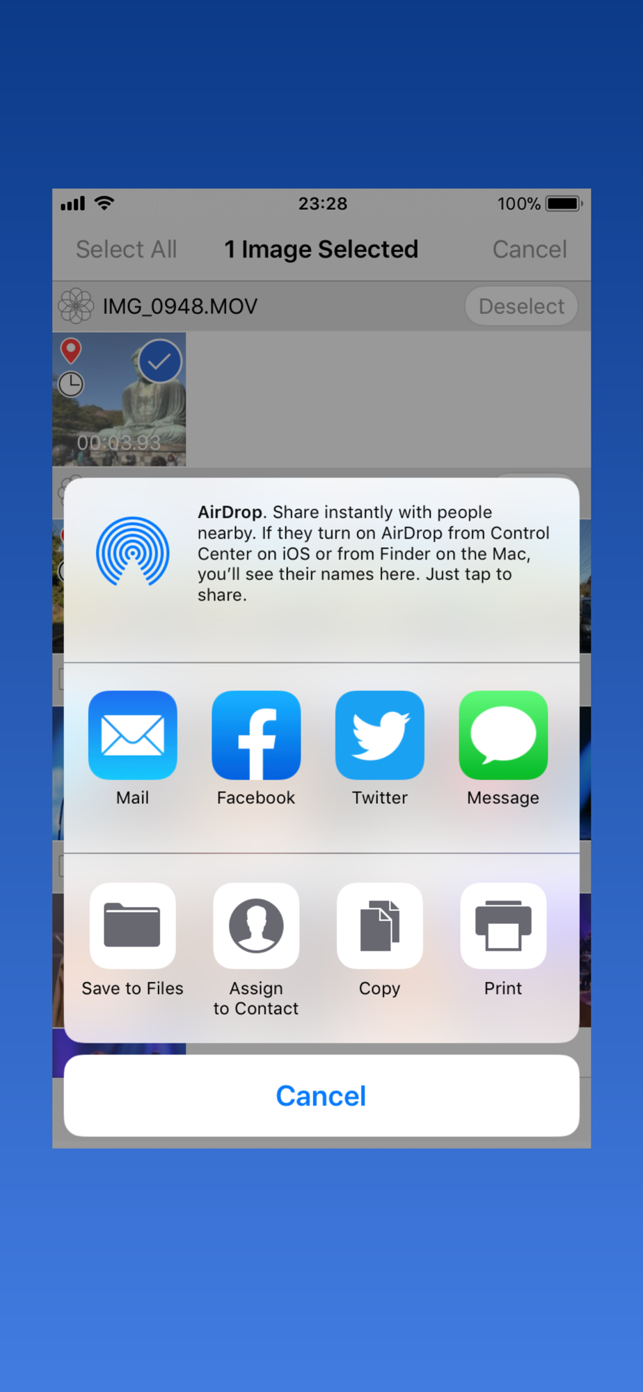 ◆Saving #1: Tap the share button to save a frame image to the Camera roll, or send to other services.