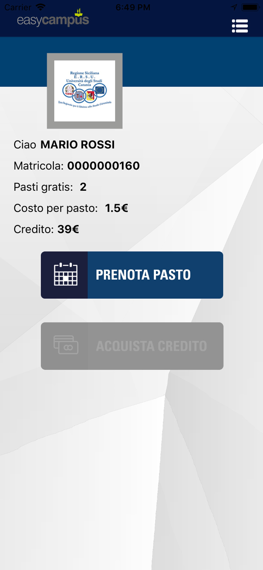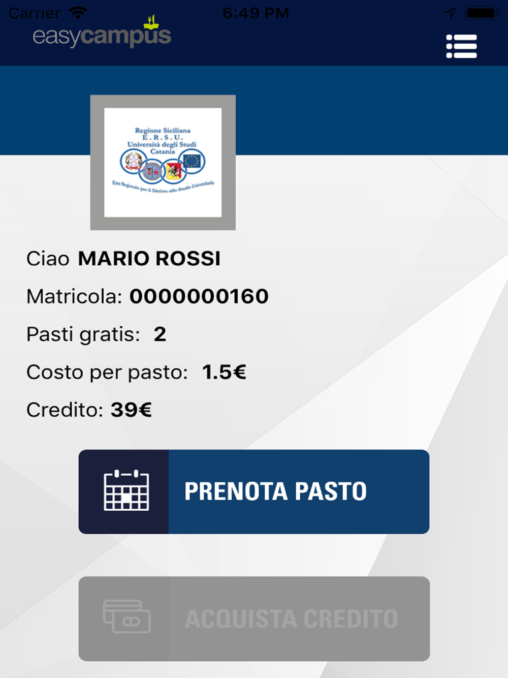 App Mobile per il servizio mensa universitaria dell'ERSU di Catania. Con questa app, gli studenti potranno fruire del servizio mensa prenotando i pasti presso le postazioni multimediali posizionate in ogni sede.