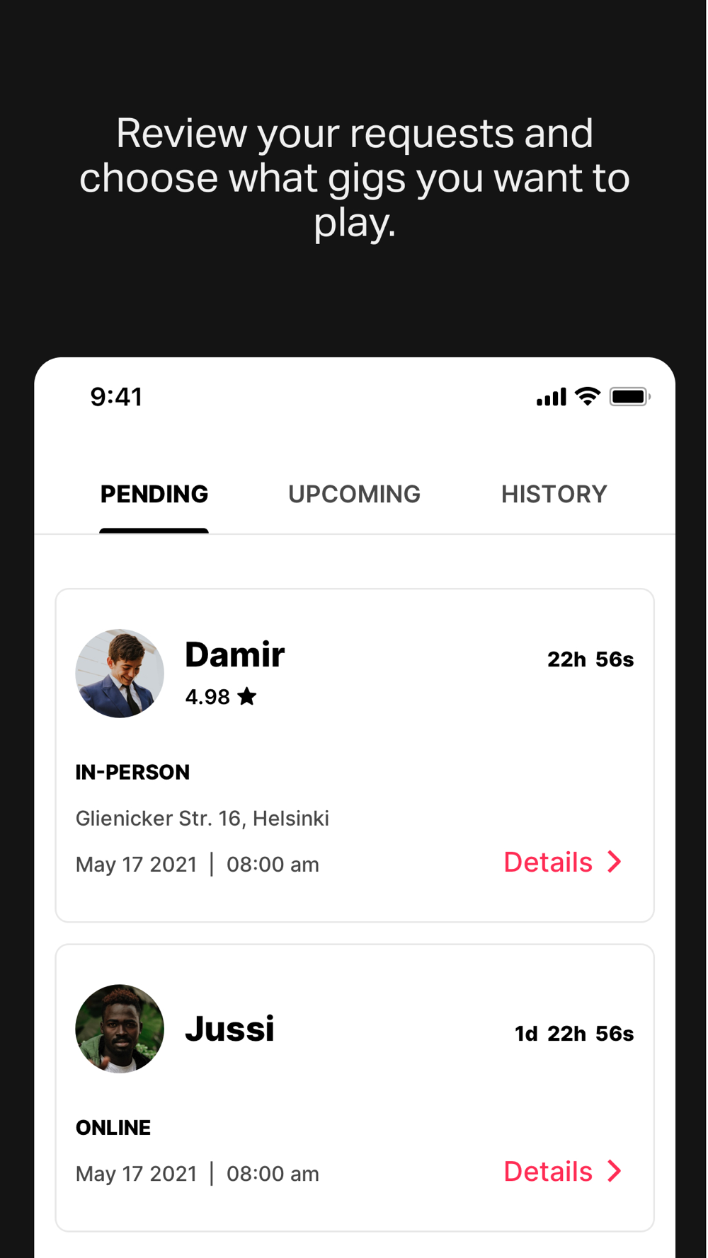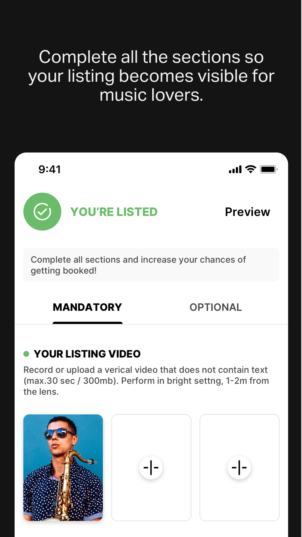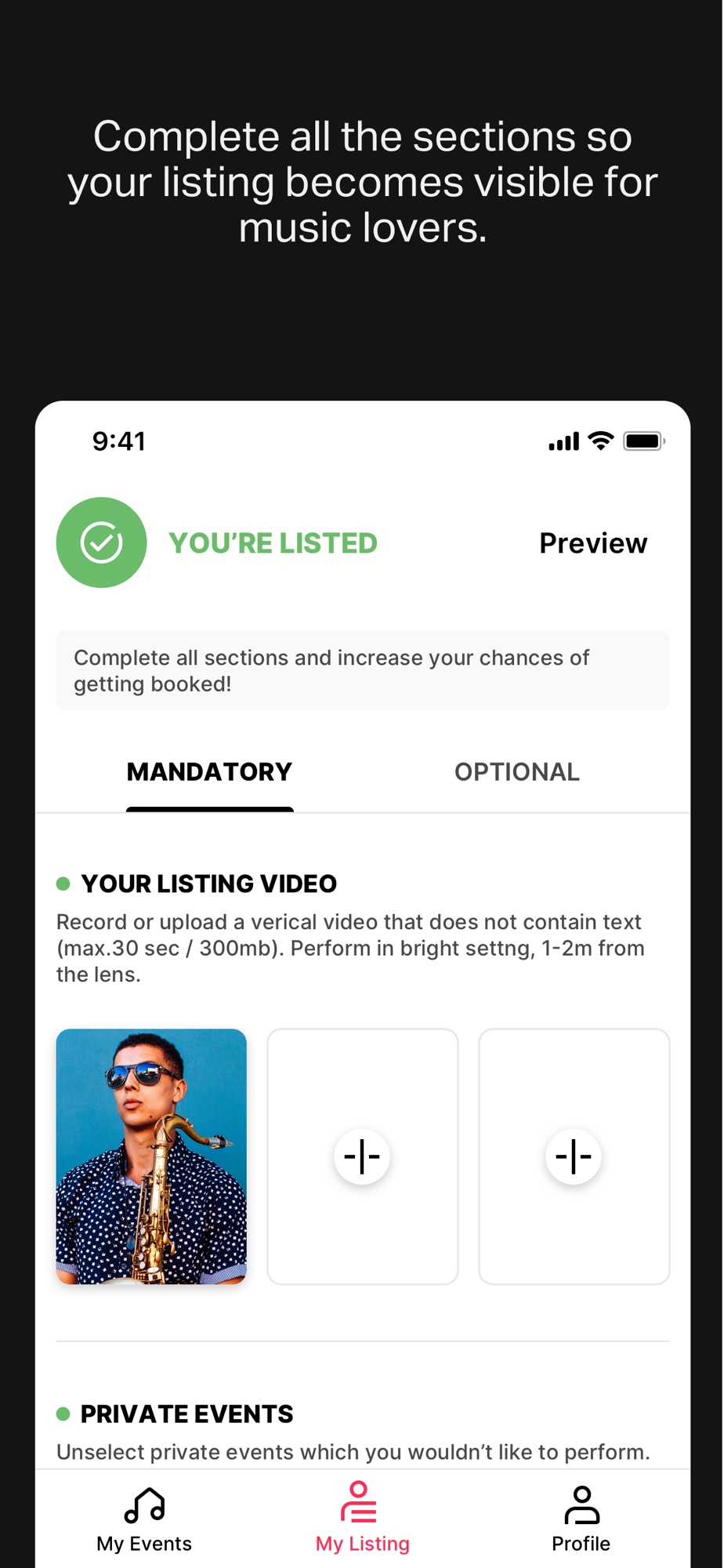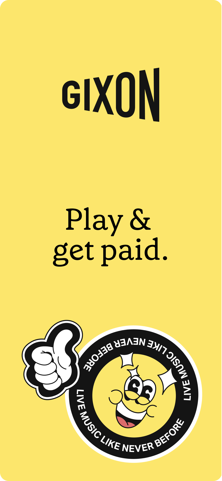 • Download the Gixon Artist app, and sign up to play in private events. We’ll help you to create your profile and notify you when you’re all set to start playing.