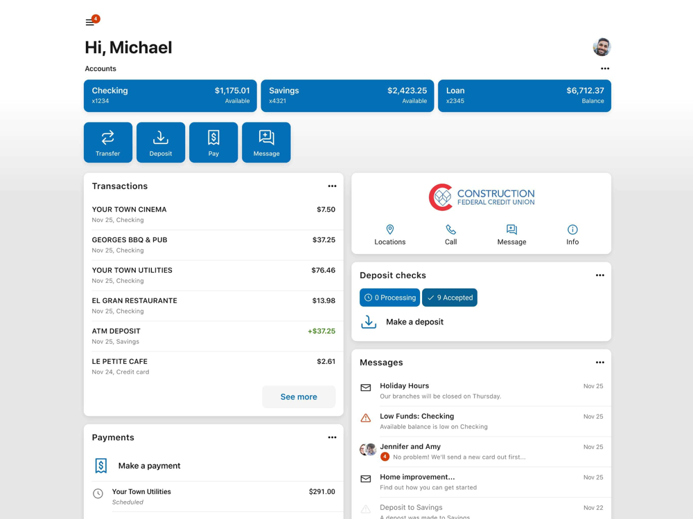 Contact: Locate ATMs or branches and contact Construction FCU customer service directly from the app.