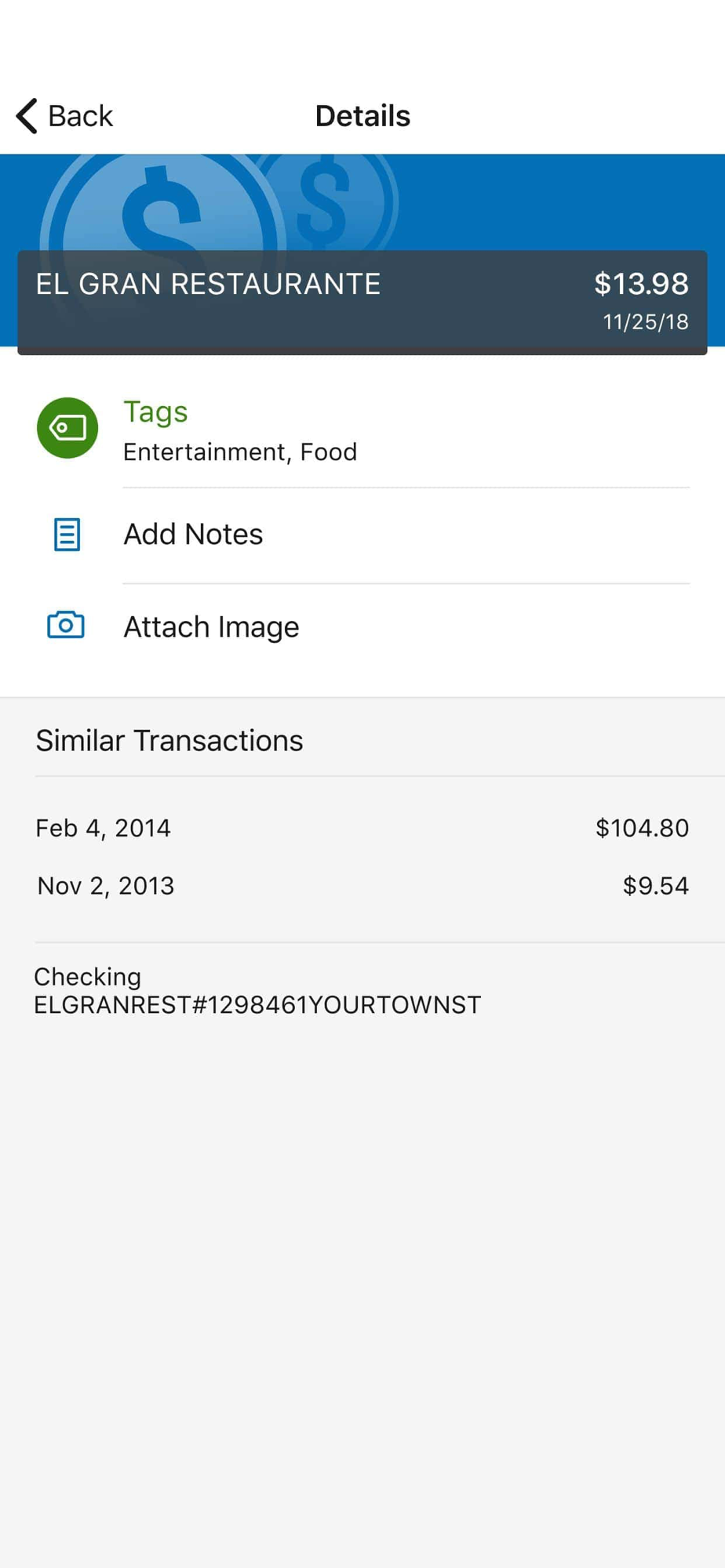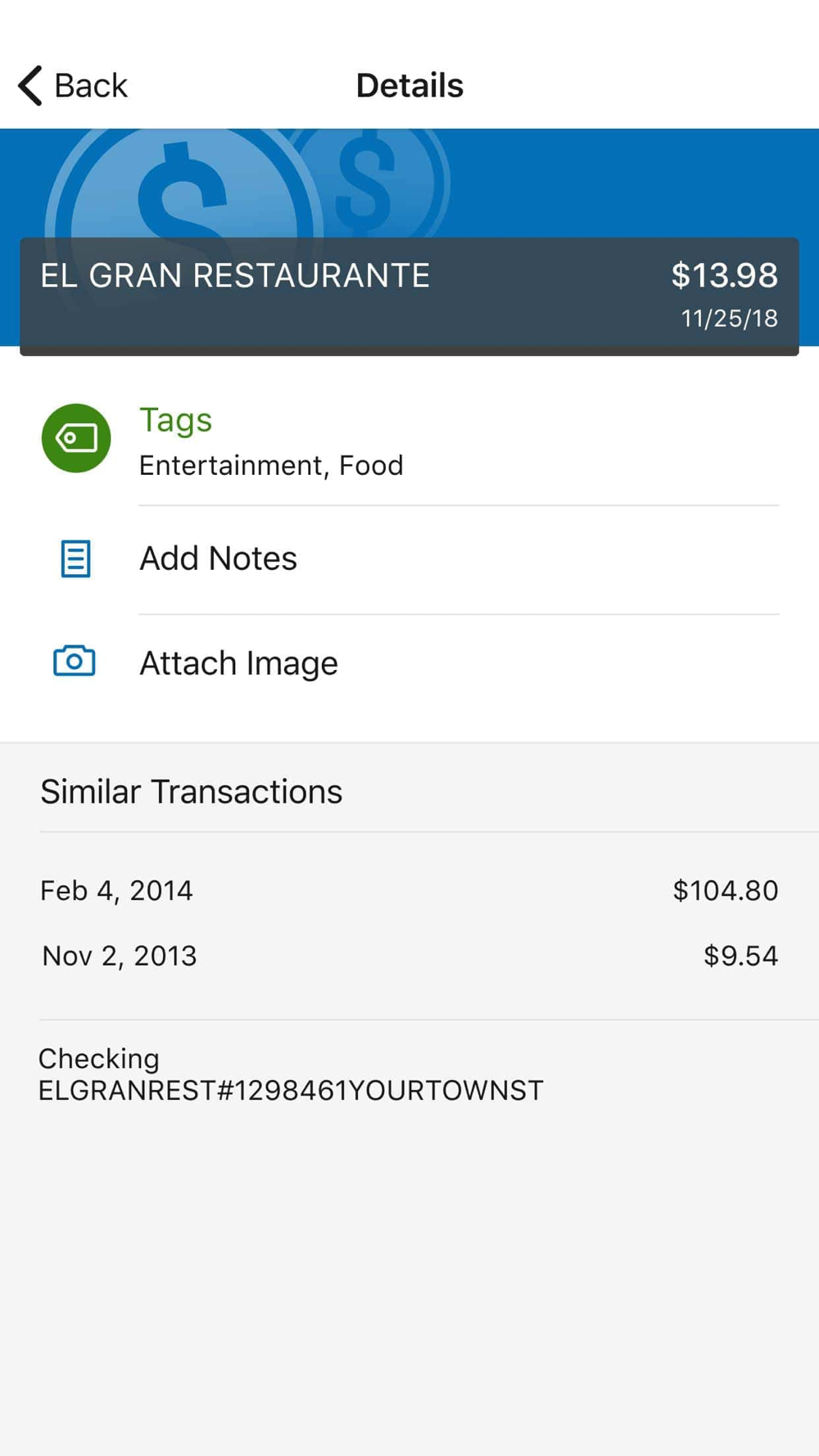 Add Tags, Notes, Images & Geo-Information: By enhancing transactions with custom tags, notes or photos of a receipt or check, you have the ability to stay organized and find exactly what you’re looking for when searching through your finances.