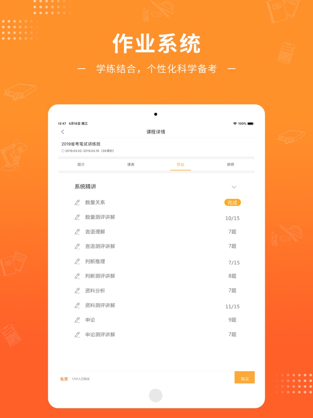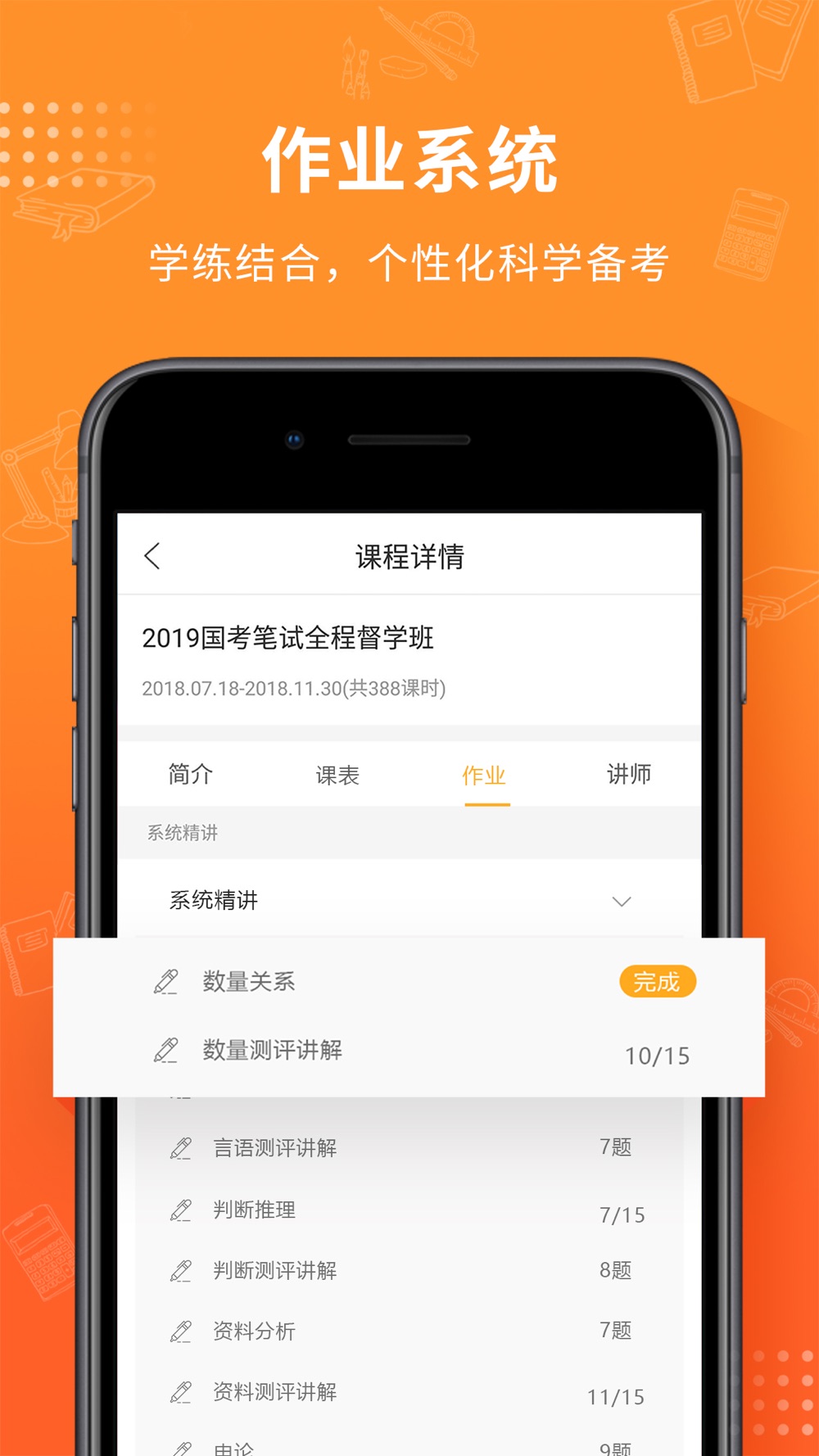 公务员考试课程涵盖行测和申论两大公考科目。授课老师均是公考行业有5年以上教学经验的资深老师。APP内提供精心录制的申论和行测方向的免费课程,每周更新。