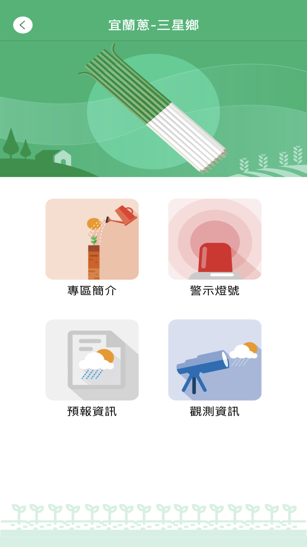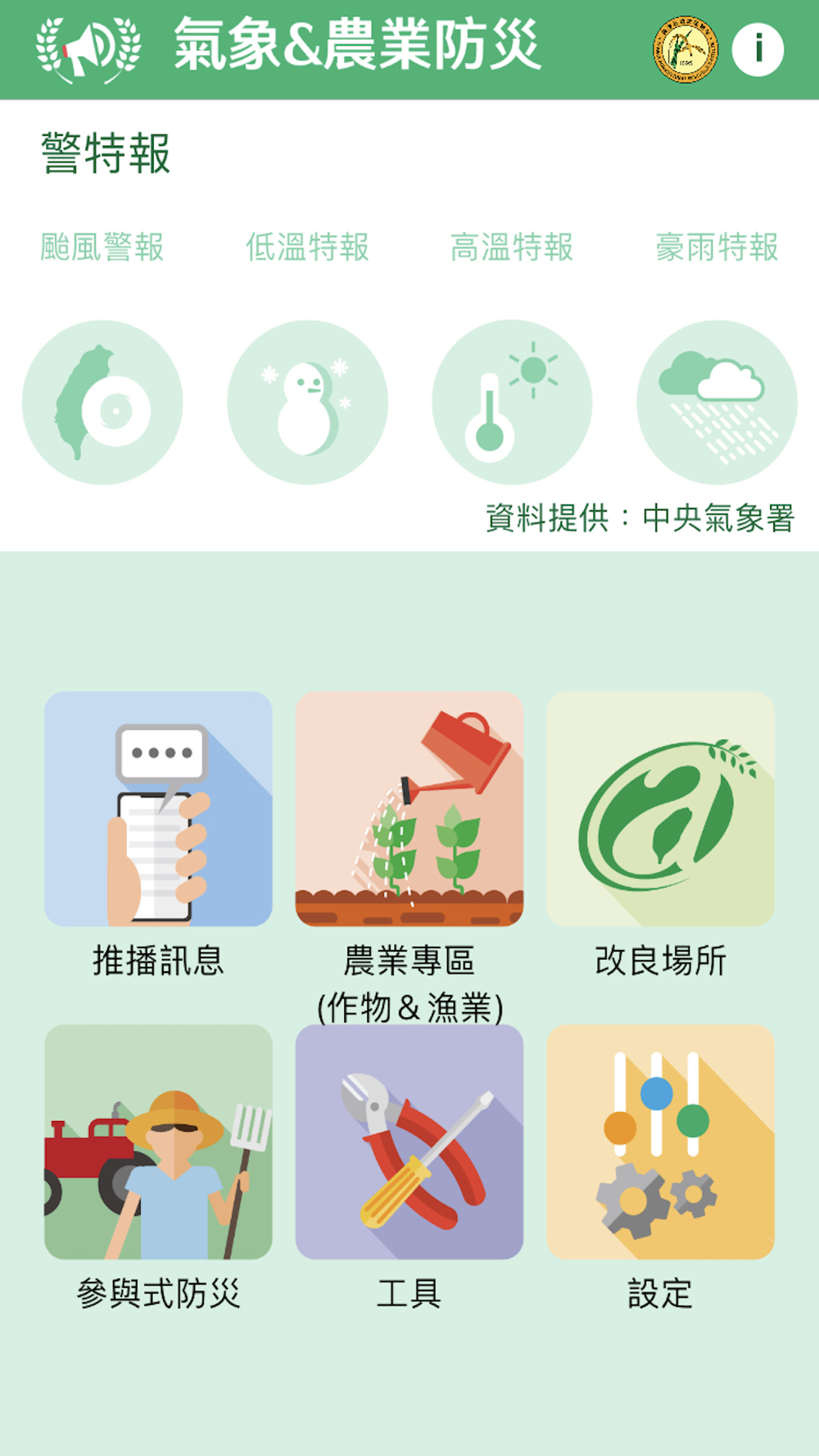 氣象&農業防災,內容包括氣象資訊、災害預報、警戒區範圍、及作物防範建議,目前具備氣象警特報與作物栽培區災害示警兩個功能項。氣象警特報主要呈現中央氣象署公佈之颱風、豪雨、低溫及強風警特報,並以圖示燈號閃爍與否說明災害警特報即時狀態,點選圖示燈號,可瀏覽警特報內容與警報區域;作物栽培區災害示警以氣象署為上游資料來源,針對各作物專區的災害別,設定達致災警示標準門檻值,則經由手機推播警示訊息,災害警示以變換燈號顏色呈現災害發生程度,點選燈號可瀏覽警示內容,包含警示說明、災害現況及警戒區範圍。