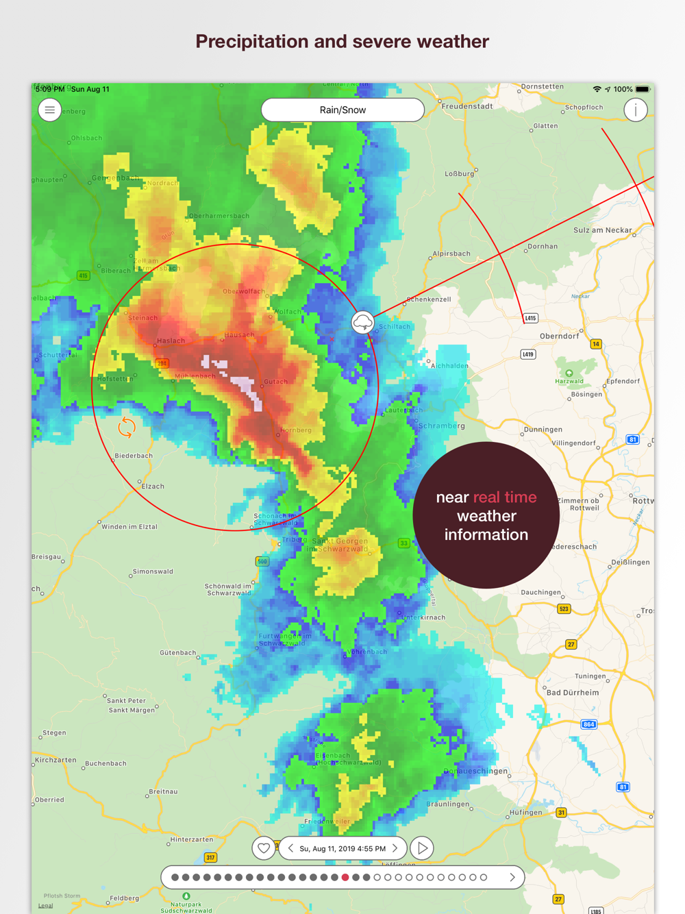 The perfect app for precipitation and storms. Real-time radar data for rain, snow, hail, as well as lightning and storm tracks. High resolution precipitation forecast for up to 24 hours. Measurement data from weather stations.