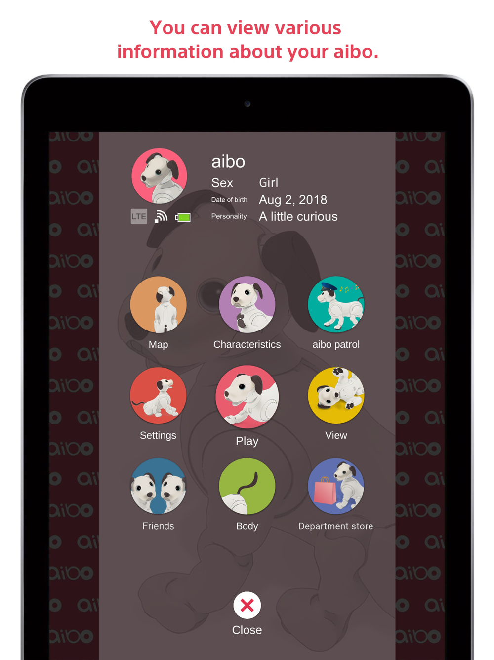 In addition to accessing system settings and owner information, other features include "aibo Photos," which lets users view any pictures taken, and a feature to "Play" with a virtual aibo inside the app.